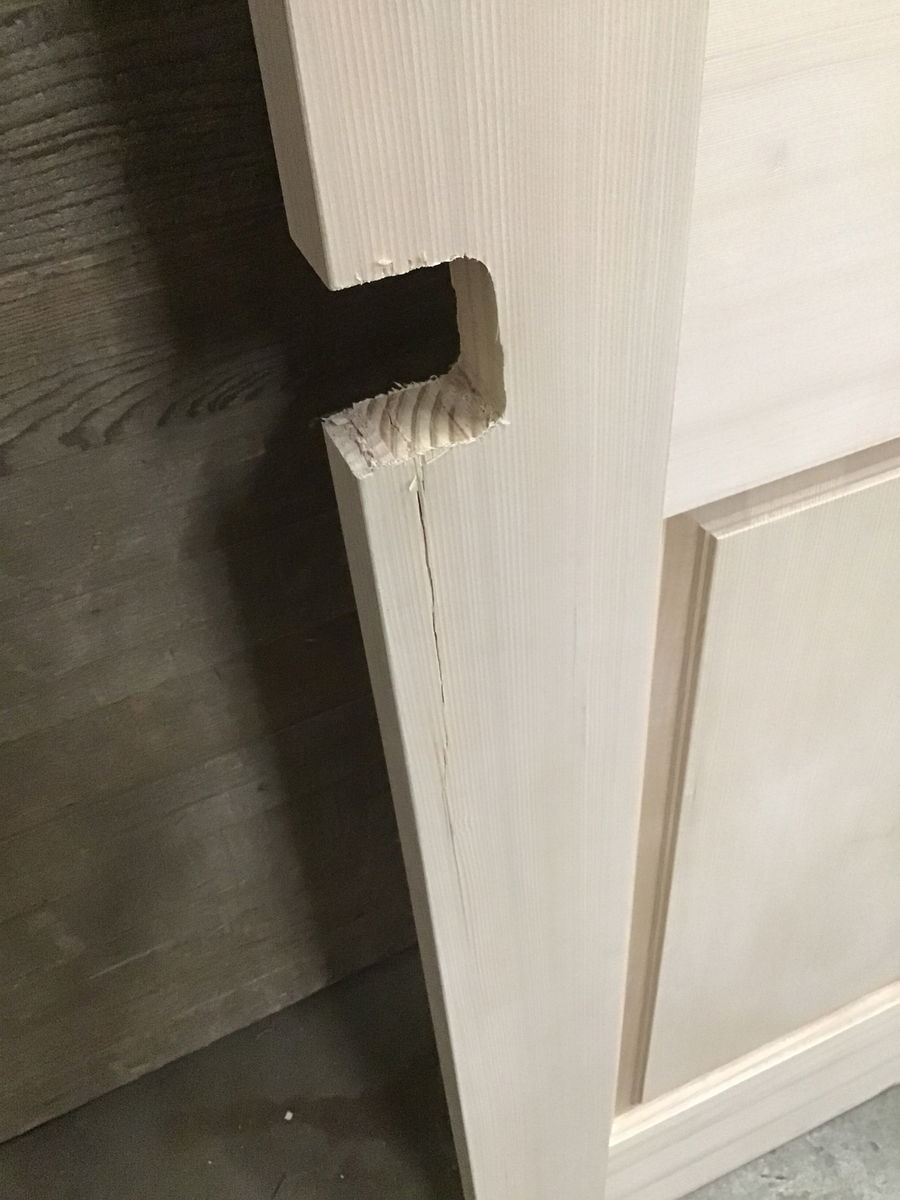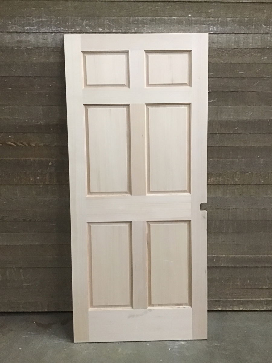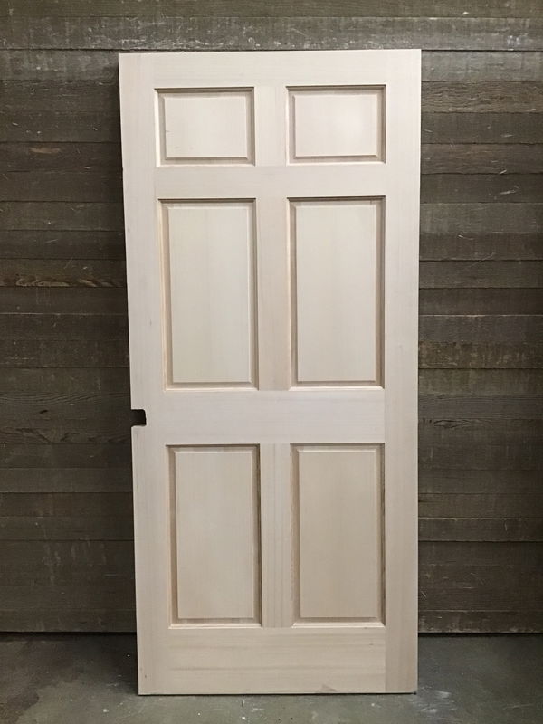 Raw CVG hem/fir interior door with a pocket door hardware cut. Has a hairline split near the pocket door cutout.