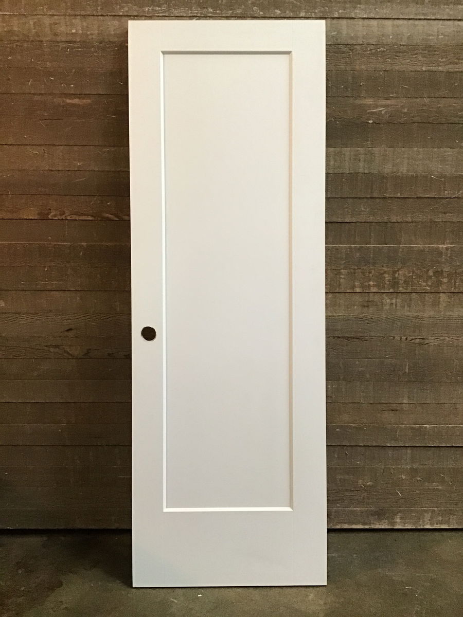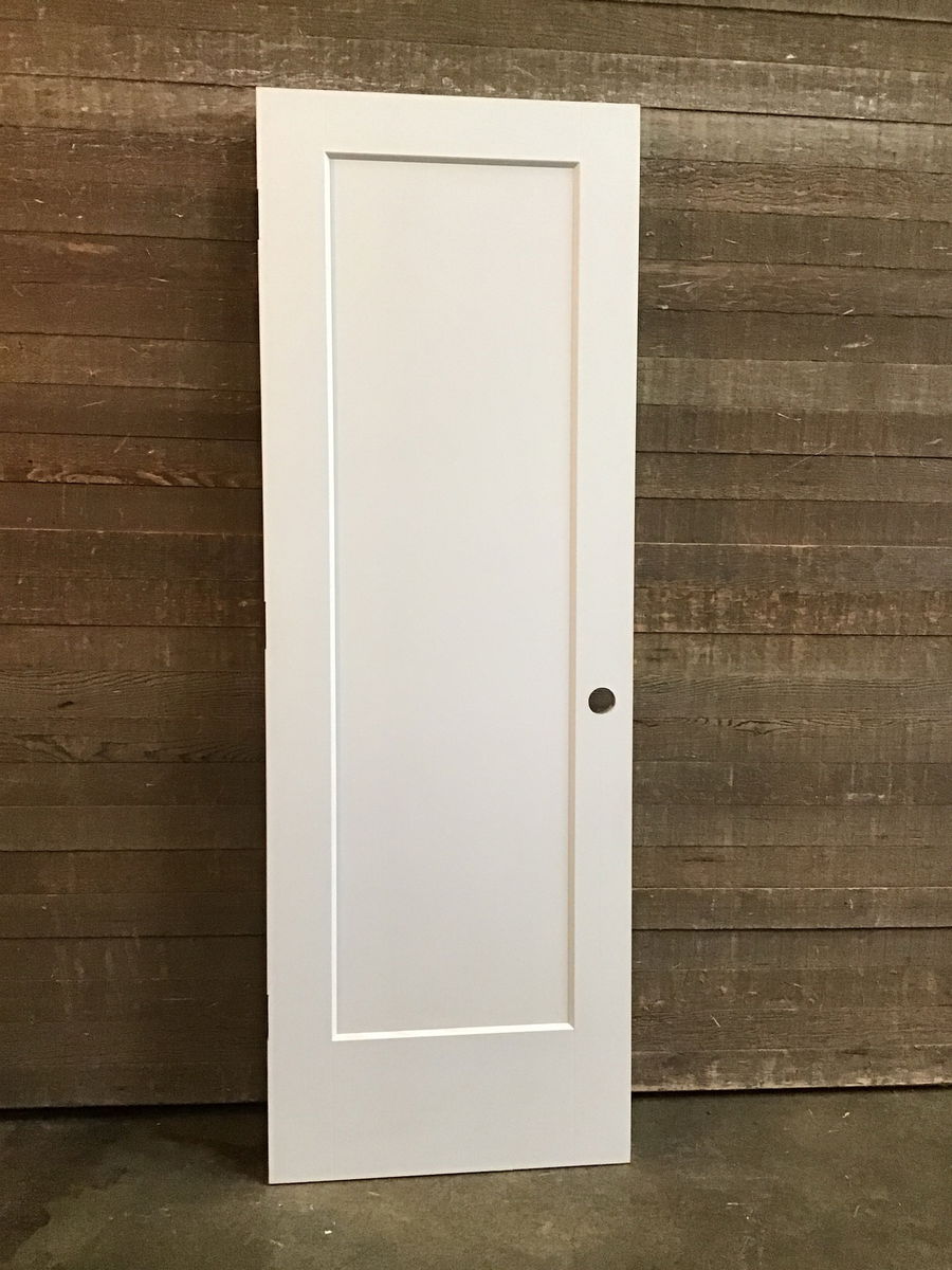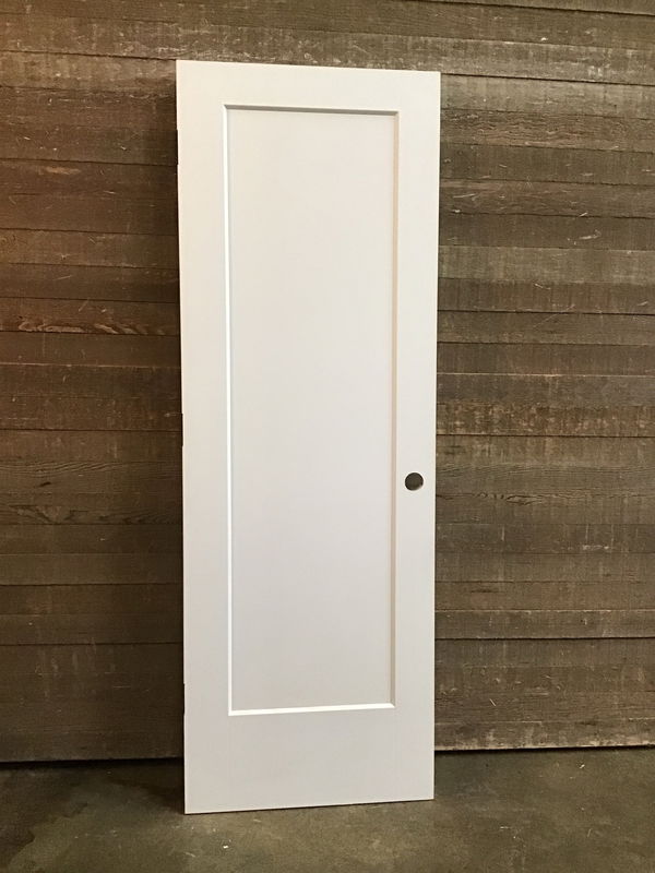 White Hollow Core Faux Single Panel Door. Never installed and looks great but may have small cosmetic blemishes. Cut for a door handle and right hand swing.