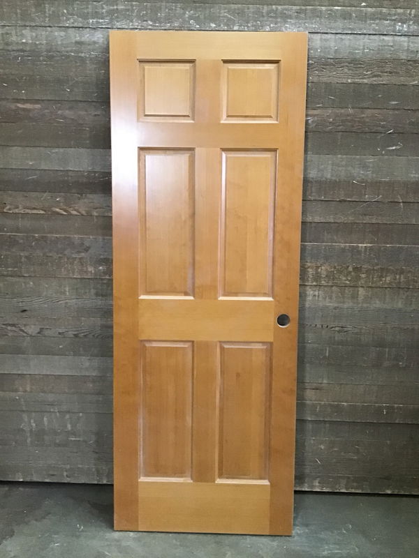 Hemlock six panel door in a medium stain finish, drilled for left hand swing. In above average condition with minor cosmetic flaws.