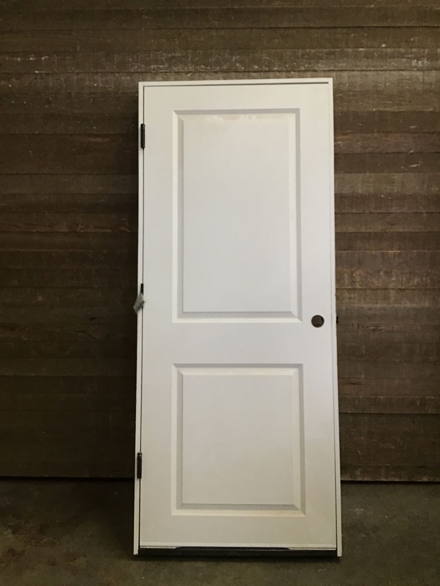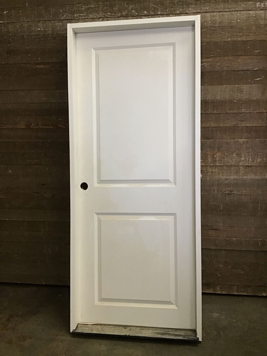 Never installed, 32" two raised panel exterior door with right hand swing hinges, a threshold and bore hole. May have minor cosmetic damage otherwise in good condition.