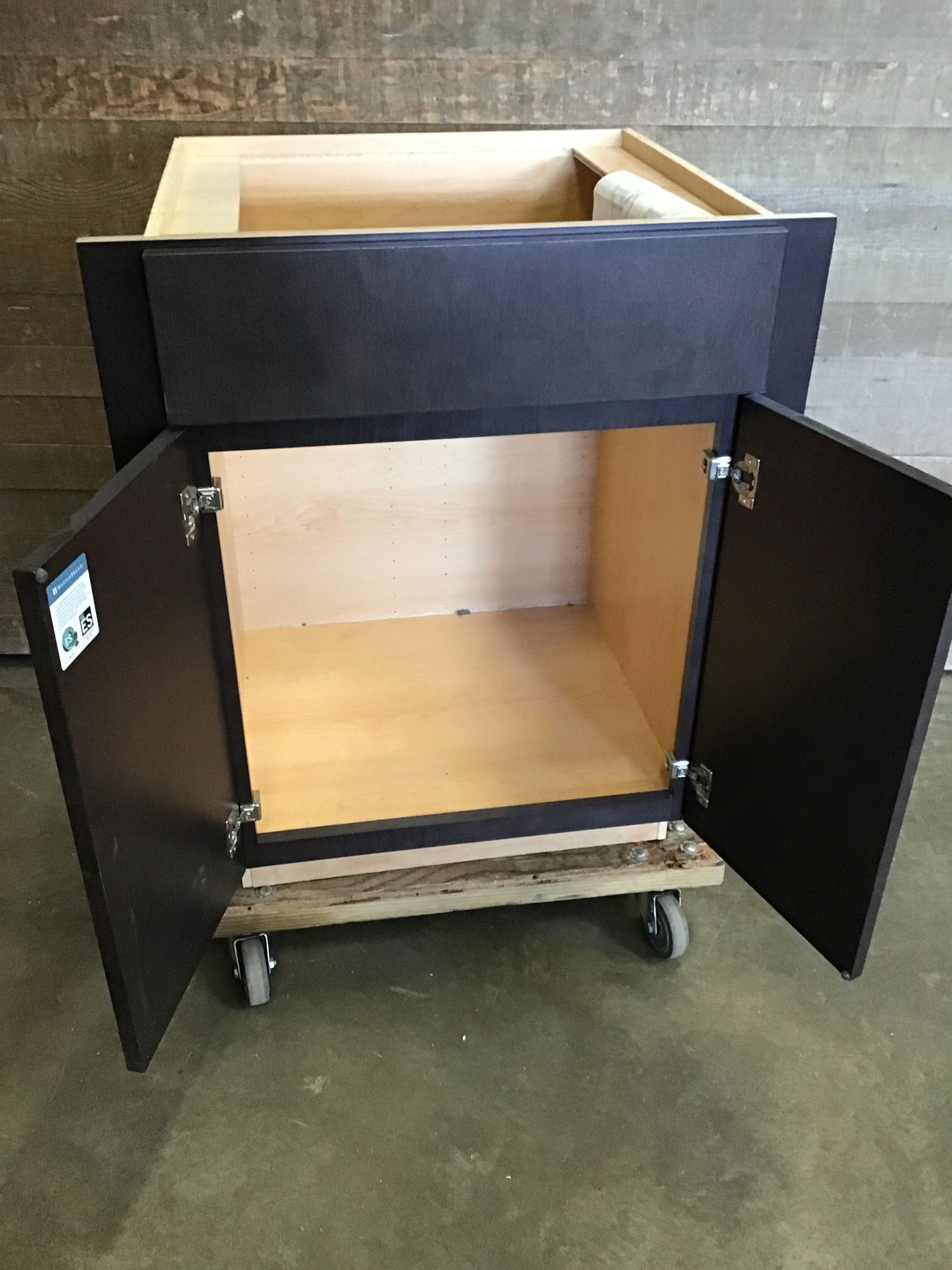 New, never installed bathroom Masterbrand vanity base with a particle board box and a faux dark stained wood laminate veneer. Has two doors and a faux drawer.