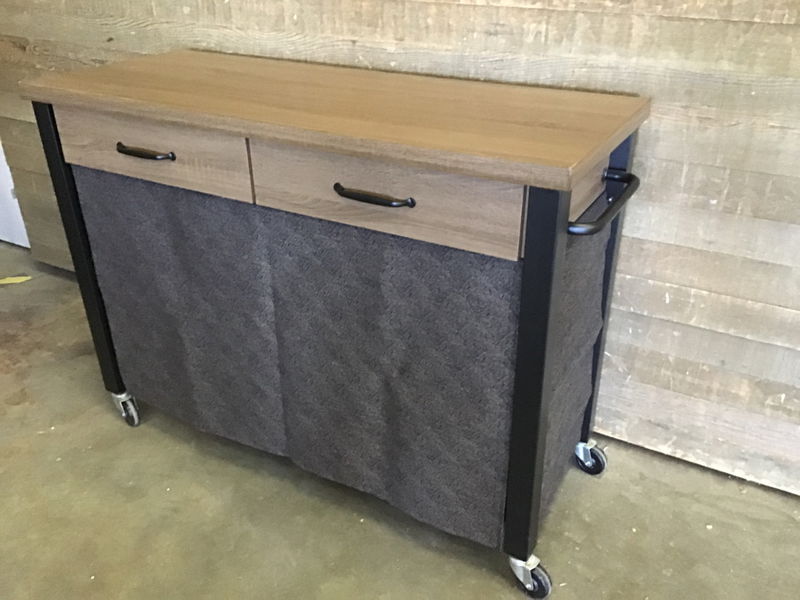 Whalen "Santa Fe" rolling kitchen carts with a faux wood top with two drawers and a steel tube metal base. Comes on wheels with two lockable casters. Sells new at box stores for $170, see here for details. Great for kitchens with limited counterspace. Comes with curtains to velcro on the base to cover the bottom two shelves if desired.