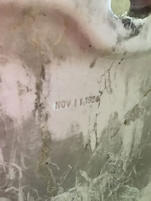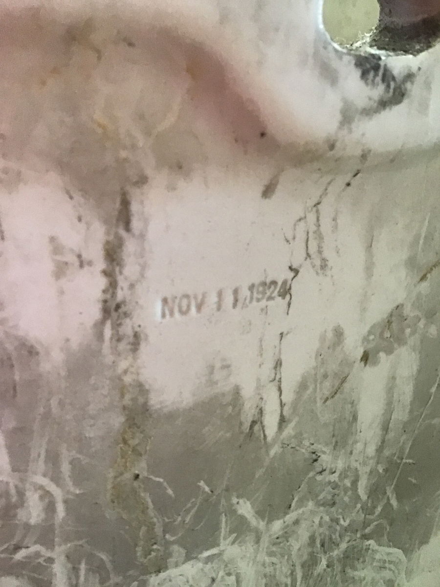 1924 Tepeco white porcelain toilet with a porcelain wall mount sink. Looks to be in overall decent condition, though it needs a good clean. It is missing the pipe at the back of the toilet, and needs a wall mount bracket for the tank. Price reflects condition.