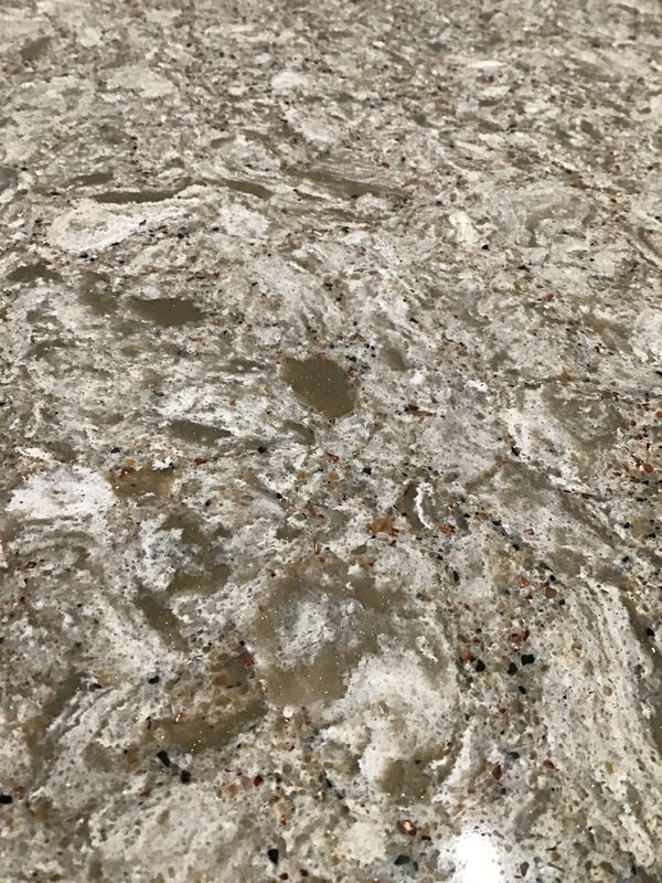 Bath vanity base with a chunky tan brown neutral granite top and matching Delta brushed nickel finish faucets. Looks to be a birch faced cabinet with a dark stain finish. Has some scratches and scuffs from use but in overall great looking shape and would be a great upgrade to replace that oudated vanity you've been meaning to swap out.