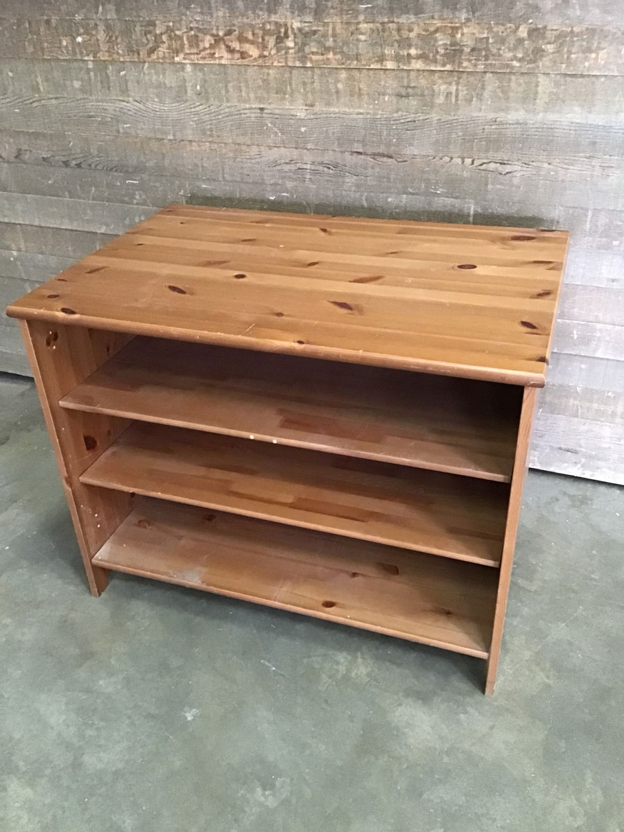 IKEA Leksvik Pine entertainment center with two removable shelves. Once had doors, but is now going for the open shelf look. There's space behind the shelves for cords to fit. In pretty good shape, though there might be some minor cosmetic damage.
