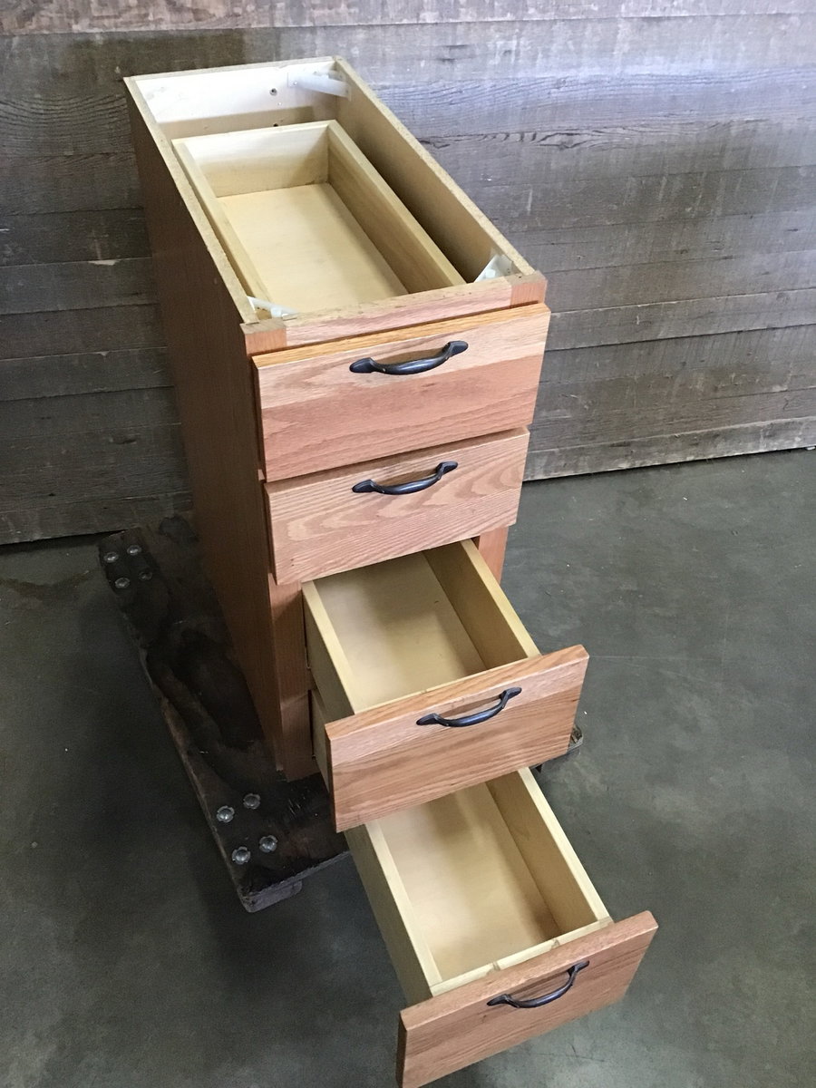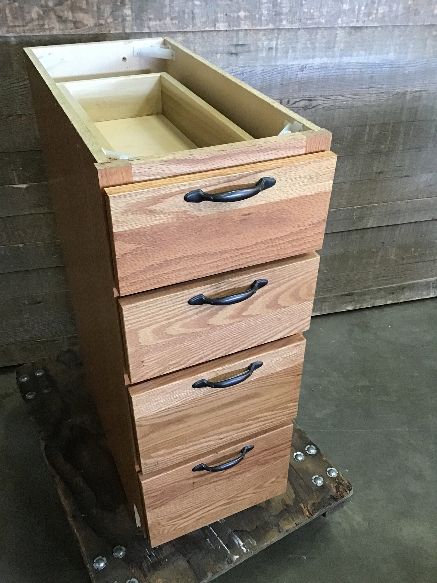 Nice looking stained Oak kitchen base cabinet in good, used condition. Built with a particle board box and drawers have nice dove tail joins. Comes with oil rubbed bronze hardware.