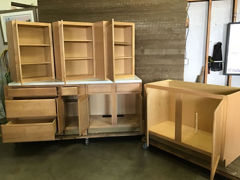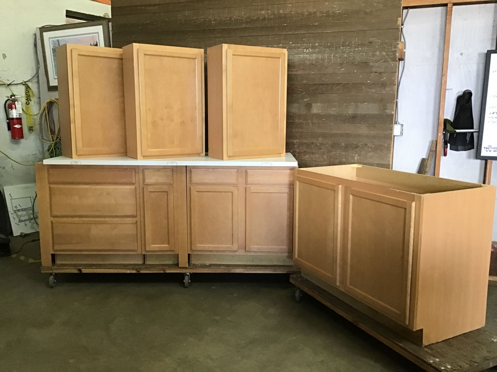7 piece kitchen cabinet set with three uppers and four bases with a light stained Birch face. Made with particle board boxes. The uppers all have adjustable shelves. Some of the bases have the option for adjustable shelving though none are included. Two of the bases have had trim added to adjust size (both widths are listed). Overall pretty clean and the perfect size to install in a granny unit or other small apartment/home.