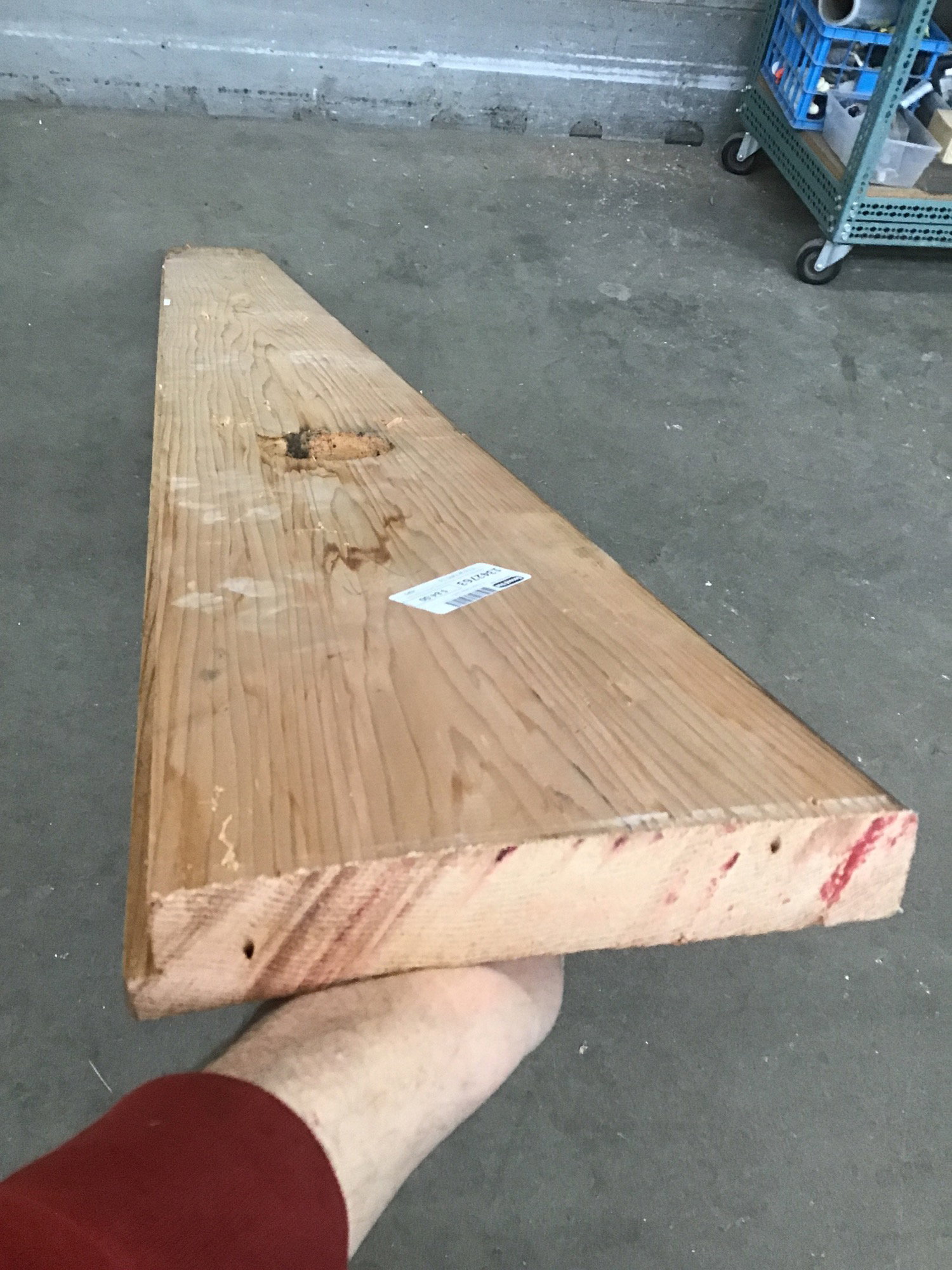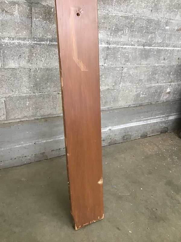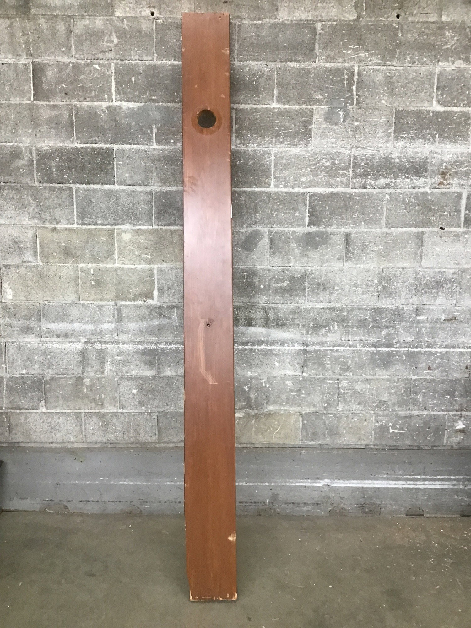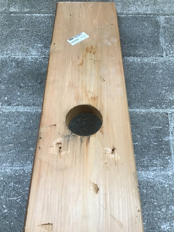 Reclaimed clear cedar 2x10 that's been partially ripped down on the back side to ~8 7/8" (see photos) and there's a chip on the bottom corner to width listed. Length is to the 3 5/8" diameter hole., but there is a smaller 5/8" diameter hole and a screw hole midway to the bigger hole. Overall length of board is 108". A KD clear cedar 2x8 runs $26.50 per LF at Limback. This one is air dried and ready for your to work. You're only paying for the 7' to the hole.