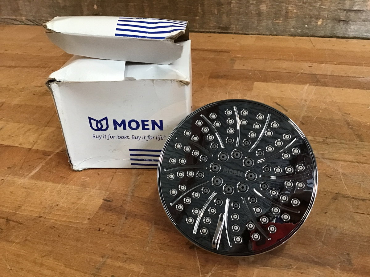 New in open box, Moen eco-performance showerhead with a chrome finish. Model 6512EP, available new at box stores for over $70, see here for details.