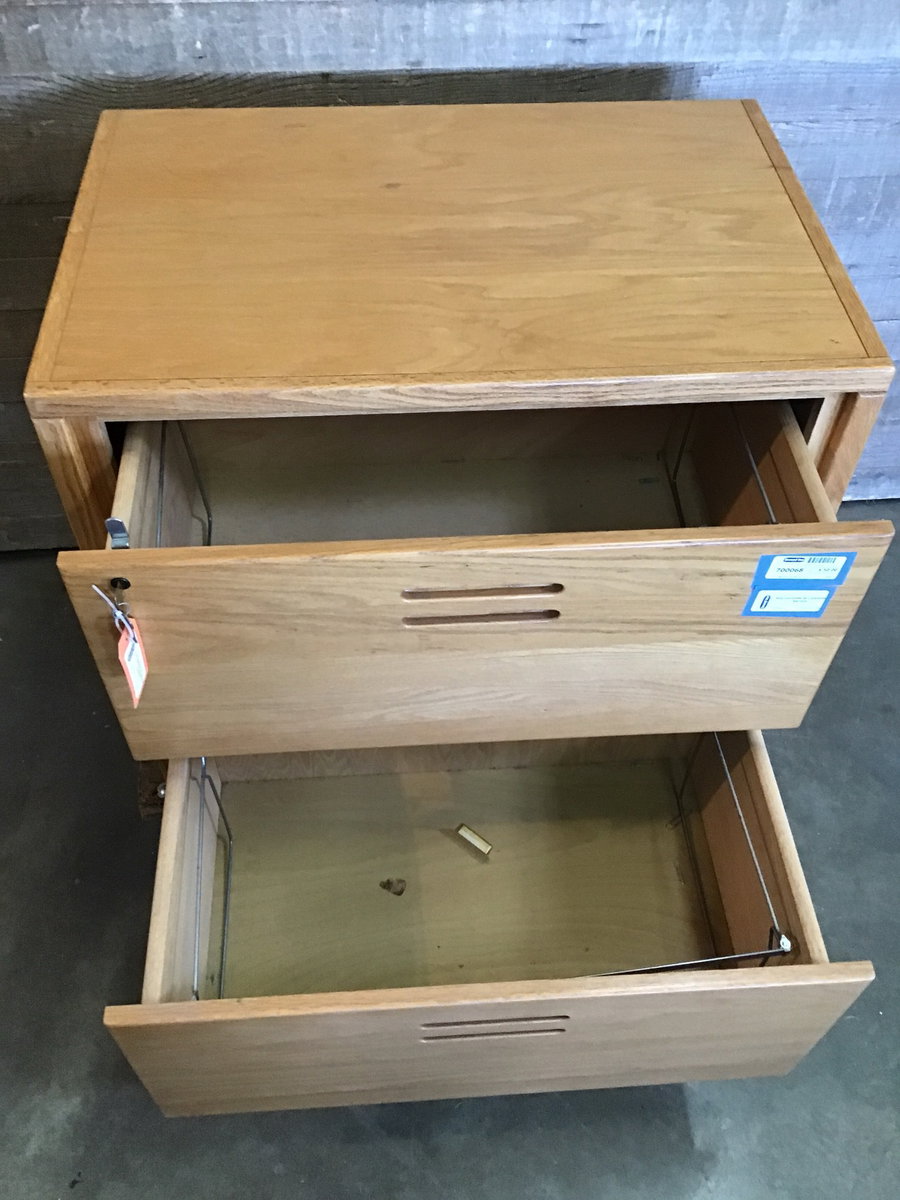 More stylish than the usual file cabinet, with a light-stained oak finish and a locking top drawer, you can store a lot of stuff in here.