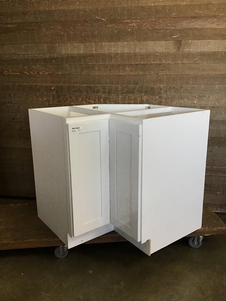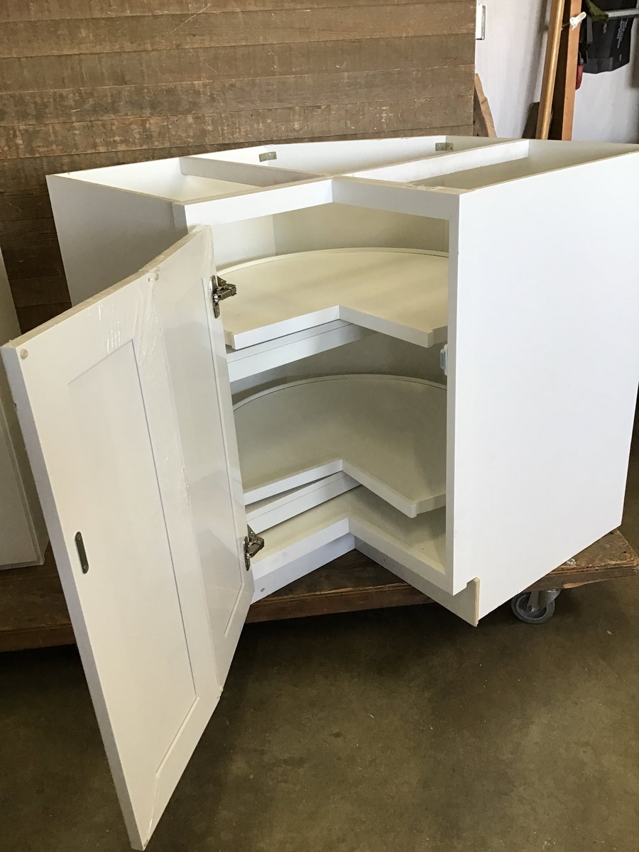 Never installed, flat white lazy susan corner cabinet with 2 shelves and plywood box construction. Has a little bump on the face but in otherwise fantastic shape!