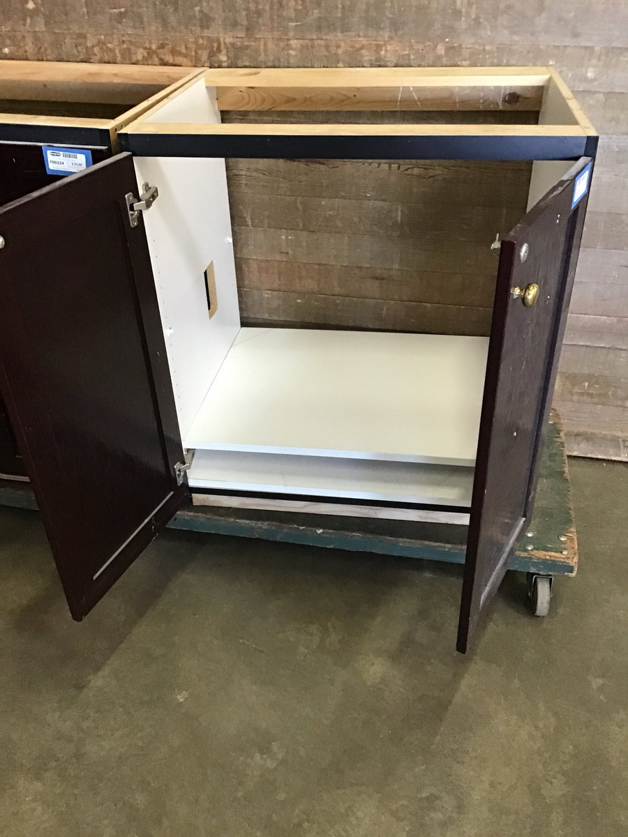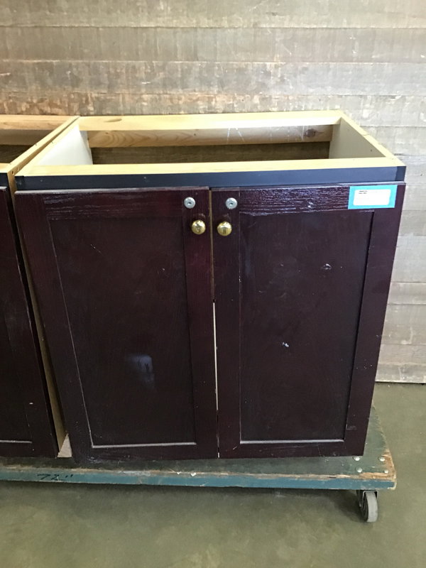 Dark stained Oak kitchen base cabinet with two doors and a particle board box. Could be used as either a basic base cabinet or as a sink base. Currently has locks installed, but no key so they will need to be re-keyed or taken out. There is the option for adjustable shelving, though no shelves are included.