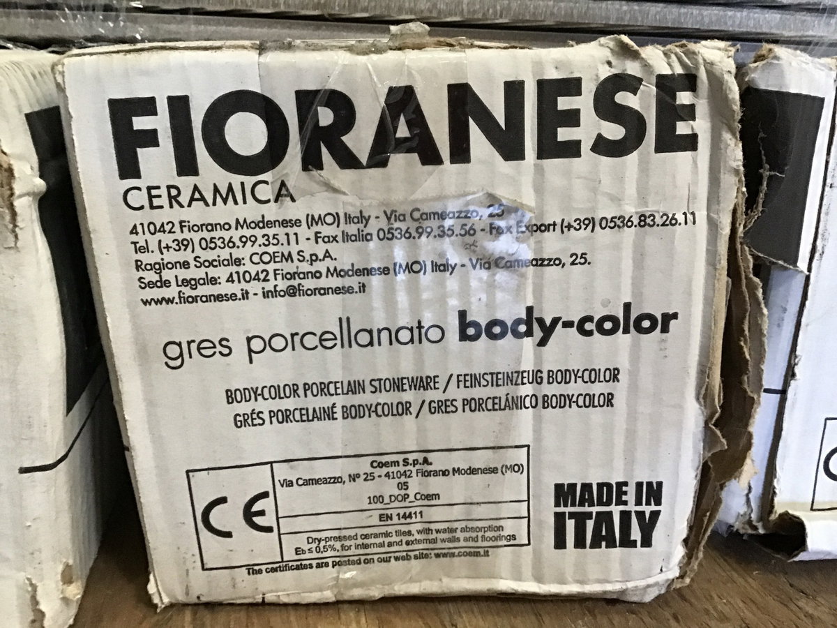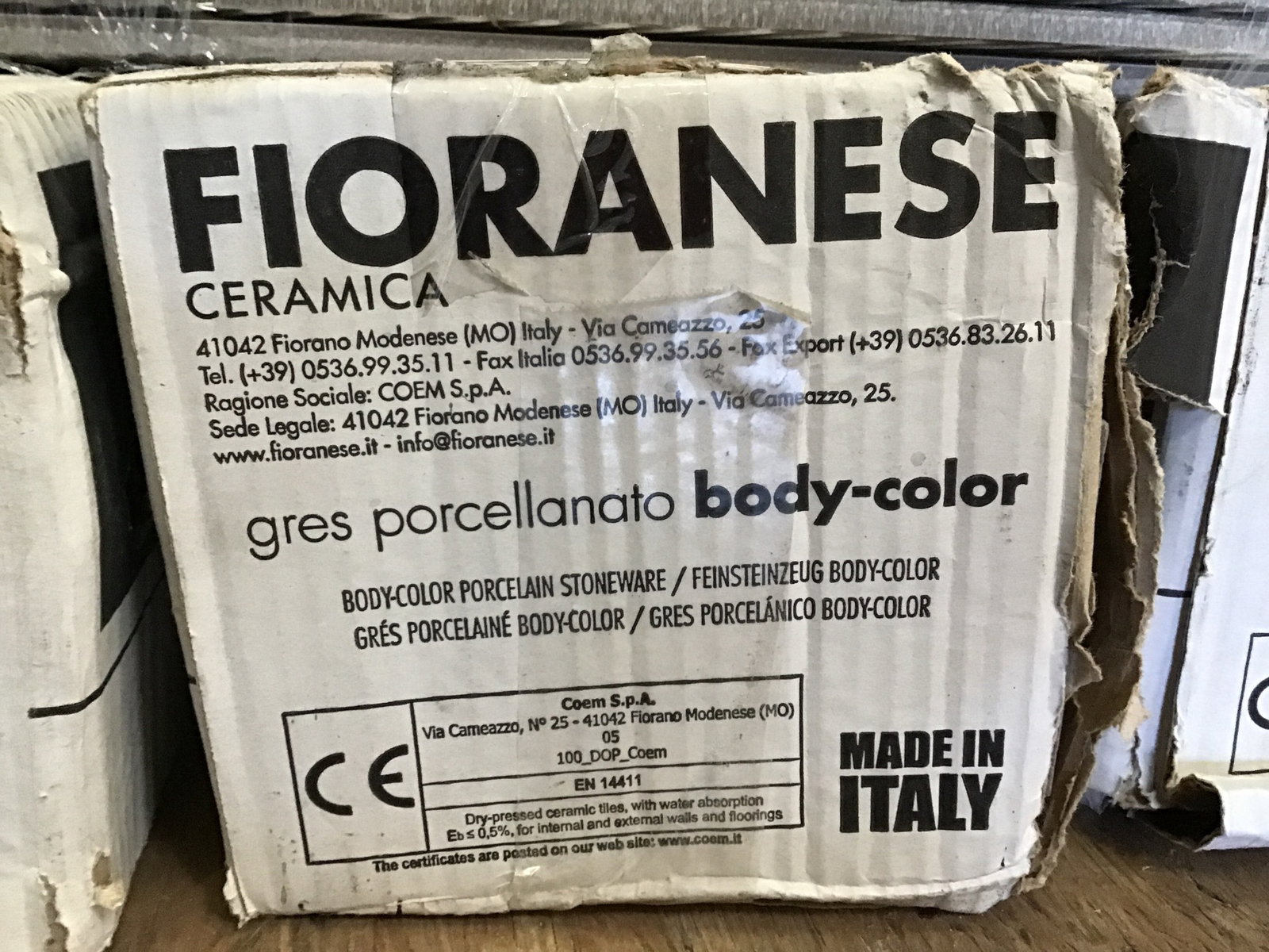 About 40 square feet of wall tile with a dark gray copper color. Each tile is 3"x16" wide. The box says the color is "Urban_Avenue Dark Copper" by Fioranese Ceramica. Good amount for a small to medium backsplash. Comes in 3 and a half boxes.