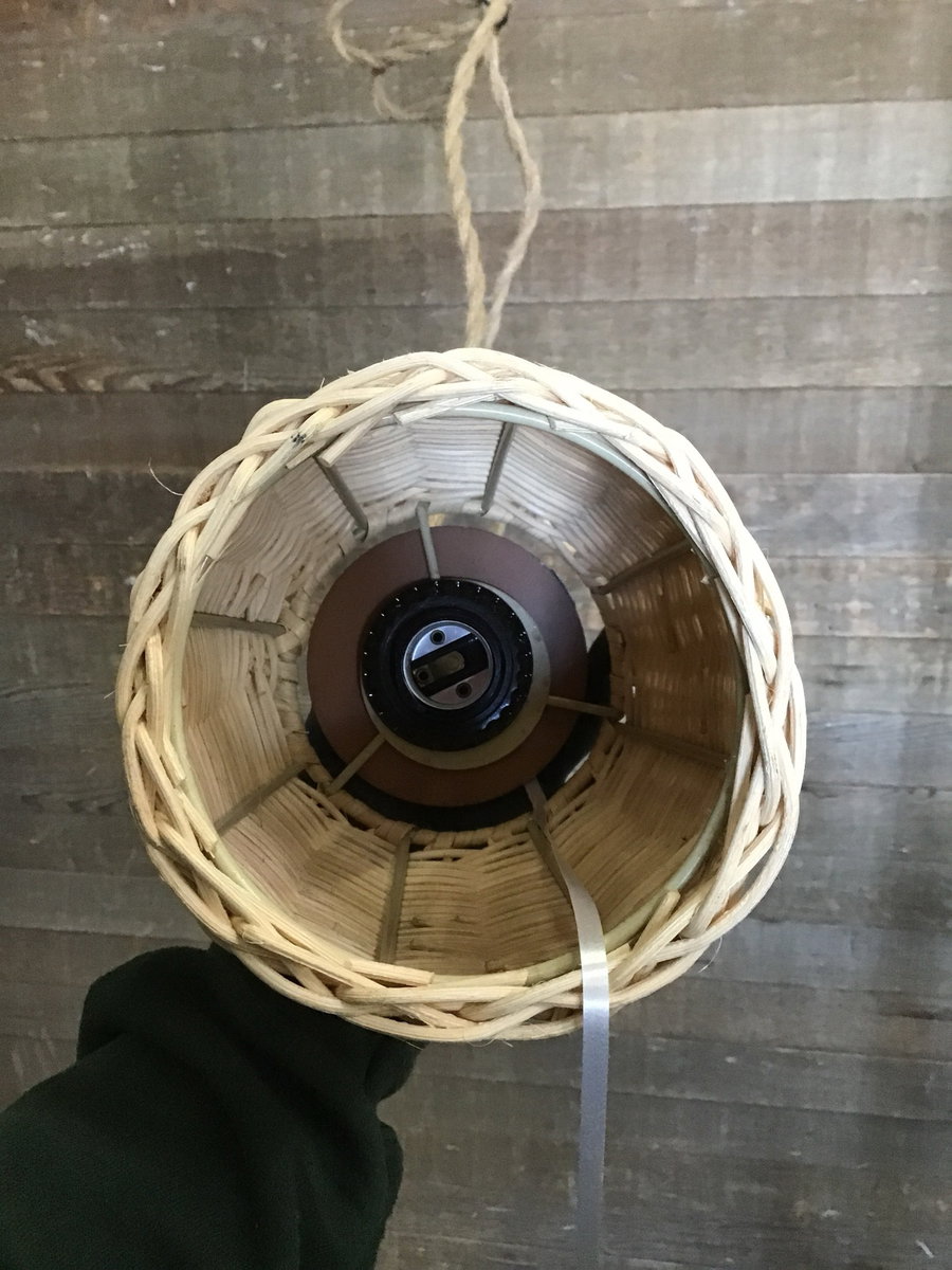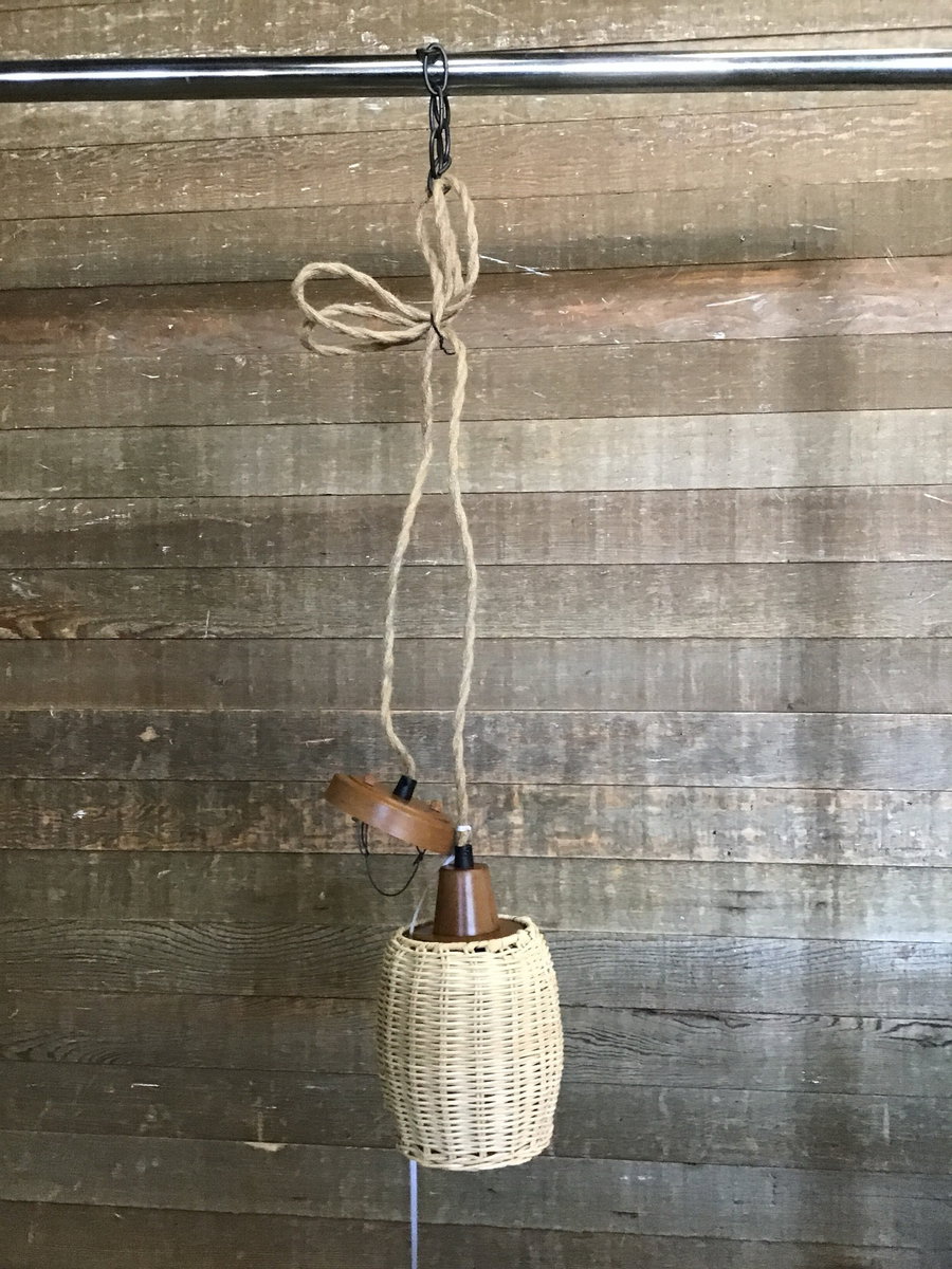 Super cute, never installed, Rattan shaded pendant light with a rope cord. Height is for the fixture and does not include about 9' of cord. This will add a pleasant defused light to any room installed. Suitable for dry locations only.