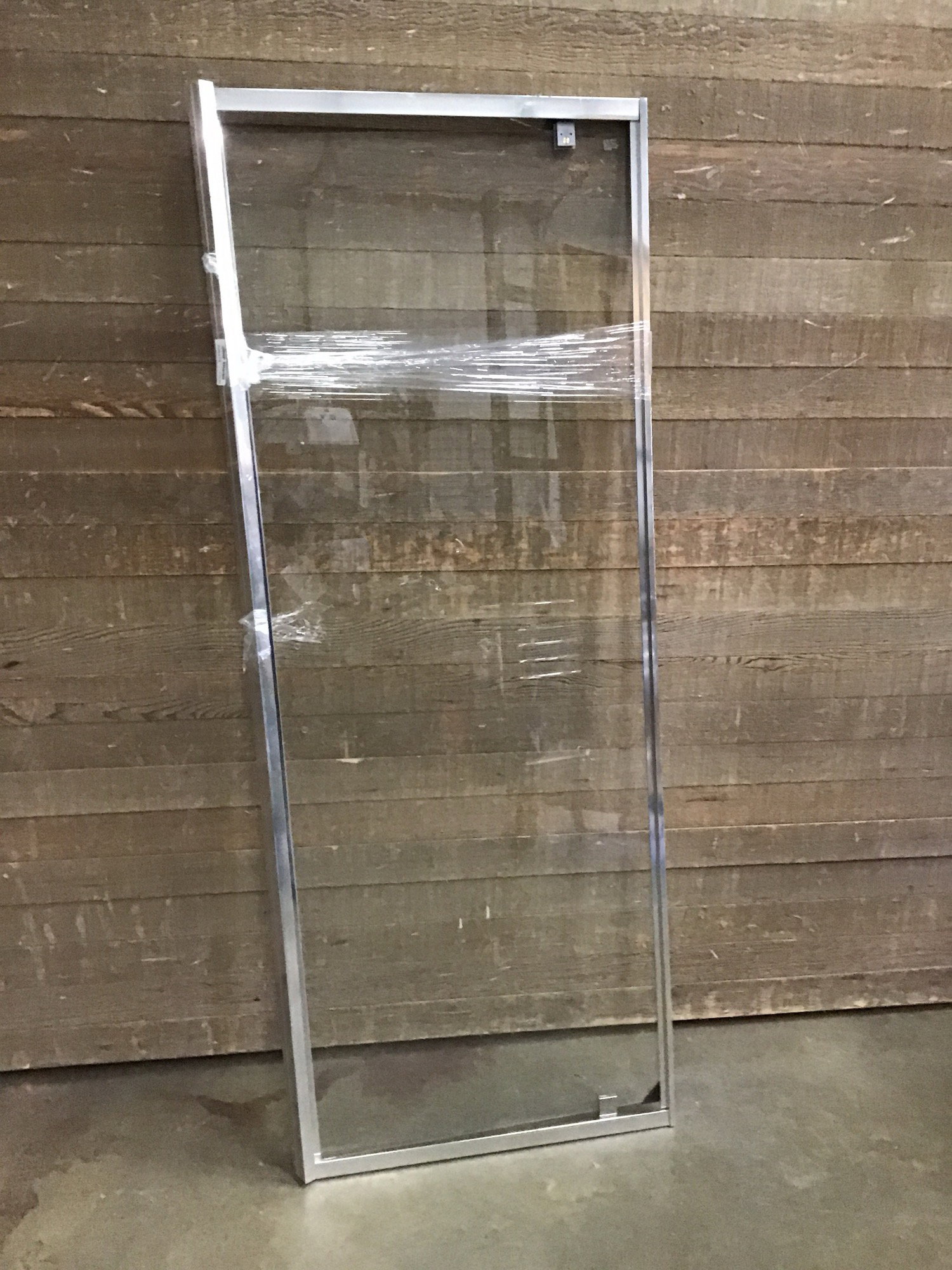 Hinged shower door made of tempered glass on an aluminum frame. We left the frame attached to the door to keep it more secure, but the frame is flimsy until it gets bolted down in its installation. Door including frame is 27.5" wide.