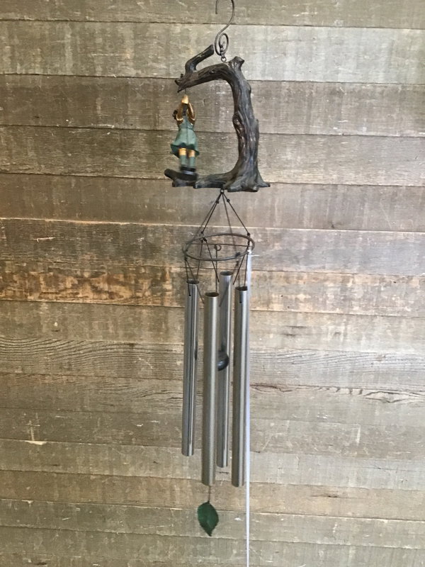 Wind chime with a girl swinging on a tree swing on it.