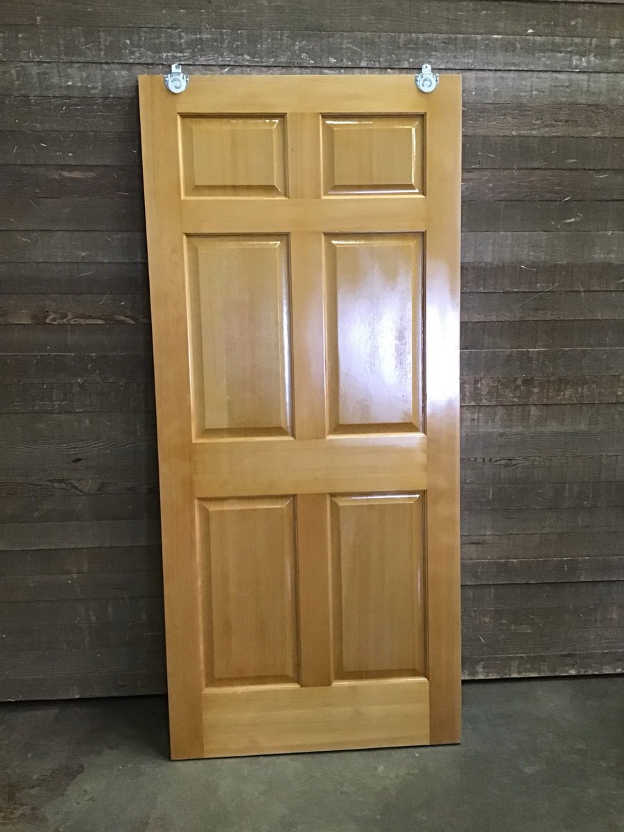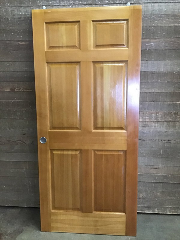 Six panel closet door with a great looking clear finish. Previously installed but in good shape. Could also make a great swinging door.