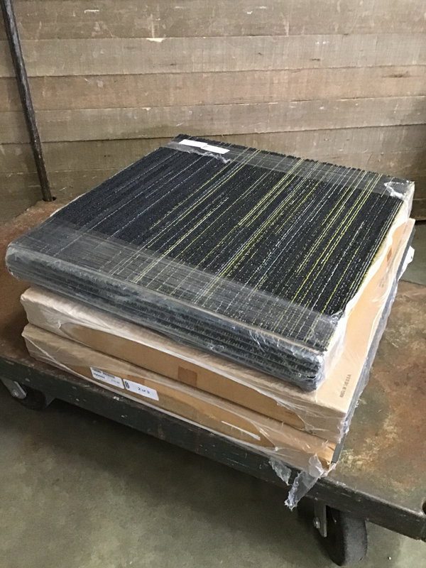140sf of high quality carpet tile. Comes in "Jackie 67496" pattern with a mixture of dark grays and yellows.