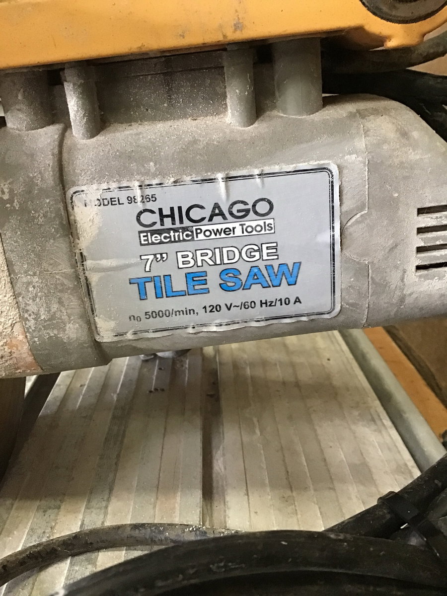 Tile saw by Harbor Freight. Motor runs fine, slide is a bit sticky, but a little WD-40 helped things move better.