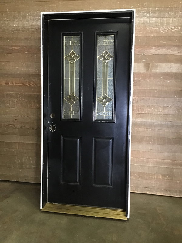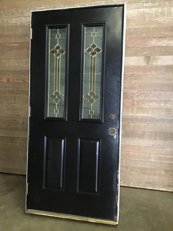 Previously installed, 36" exterior steel clad door with some stunning leaded and obscured glass panes! Glass is also true divided and tempered. Is a right hand swing door with double bore cuts. As for damage, its mainly cosmetic that I see if any. After a proper paint job this door will shine at its truest potential!