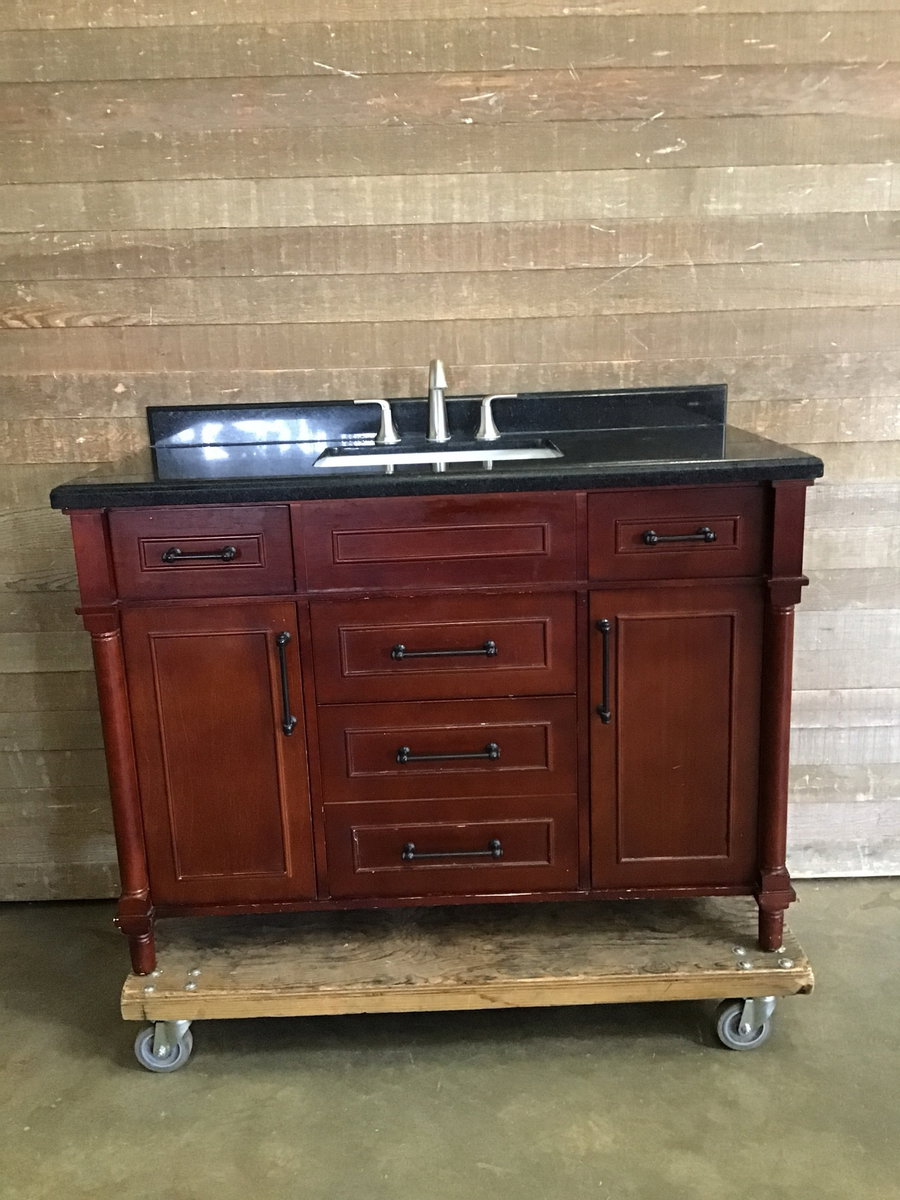 Higher end bath vanity cabinet by OVE Decors. Comes with nice soft close cabinet hardware, sink and faucet mounted on a black granite top with the backsplash installed. Face has some wear to the finish, as well as inside the drawers. With a little touching up could be a great plug-and-play solution from a well respected brand!