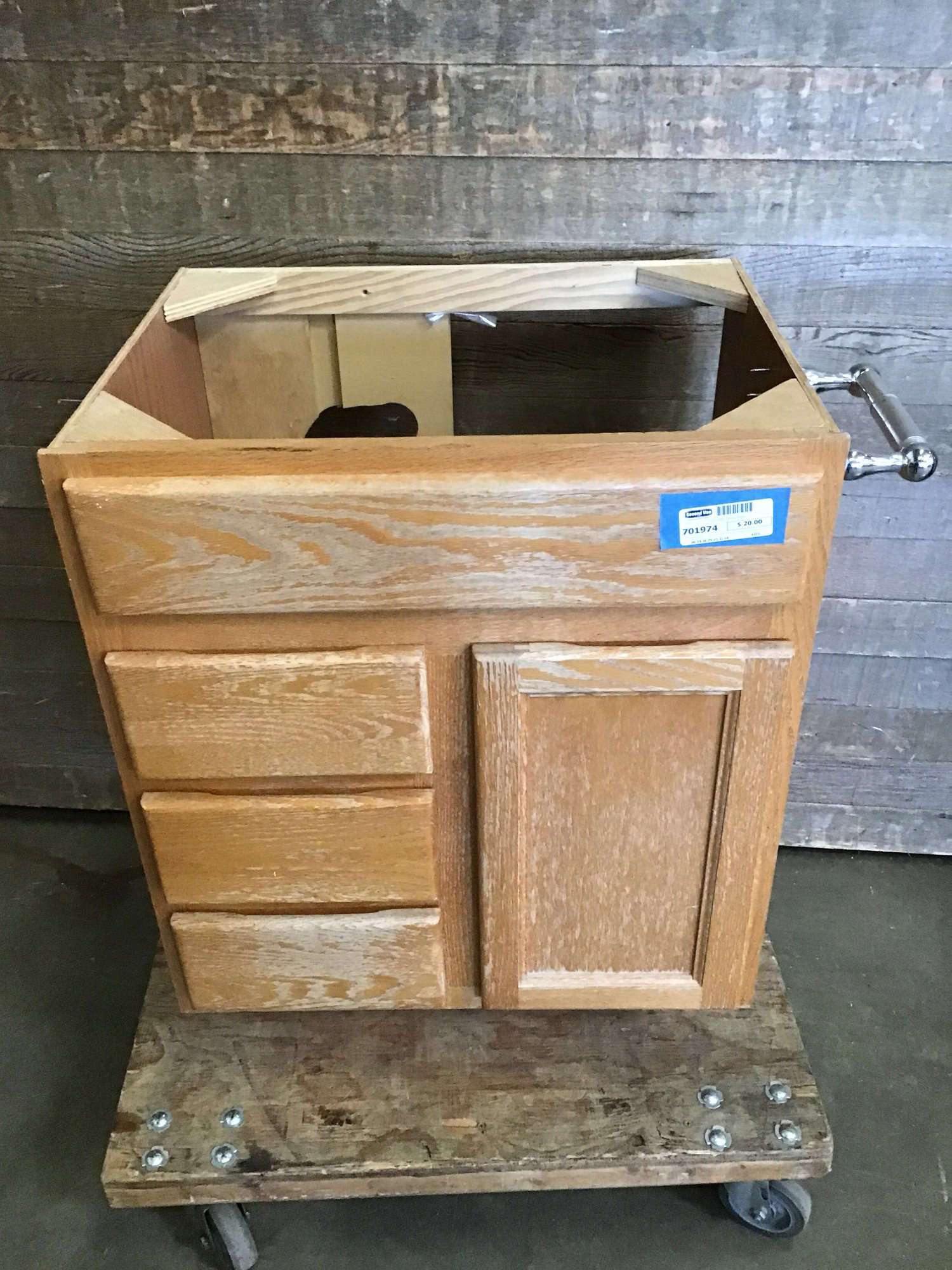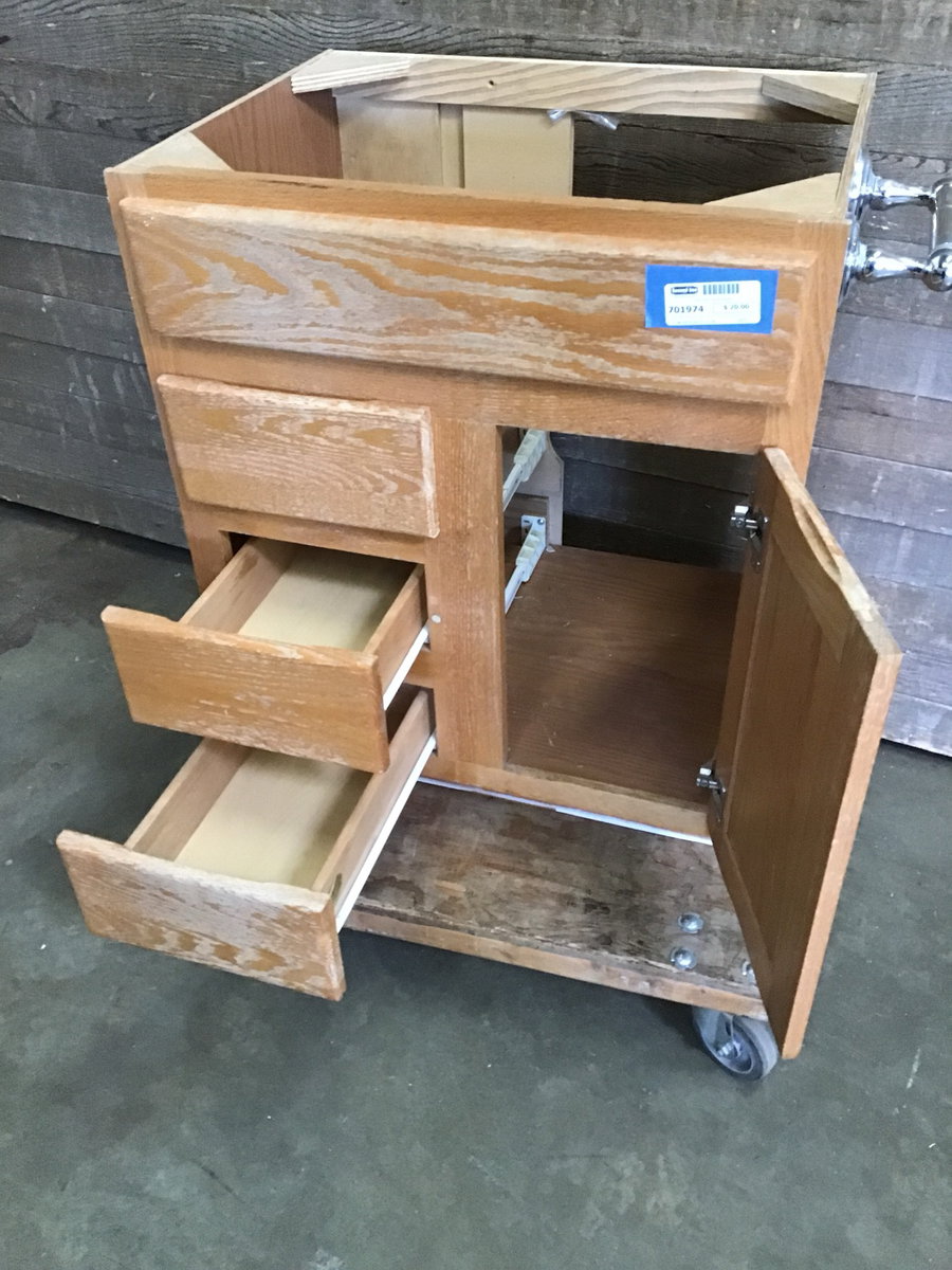Oak bathroom vanity base with one door and three drawers. The finish is a little rough, but it could be refinished with stain or paint. Price reflects condition.