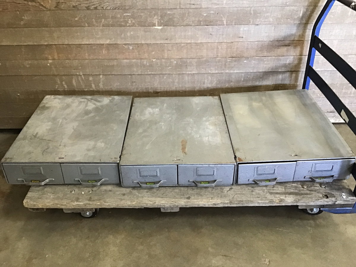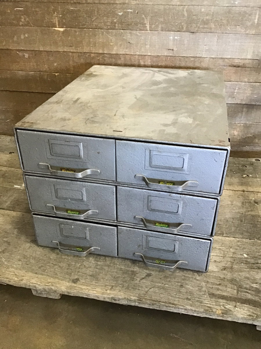 A set of six vintage steel shop drawers, each pair of drawers is stackable and movable so you can adjust them for your space. Used, but still in good condition and great for storing your tools!
