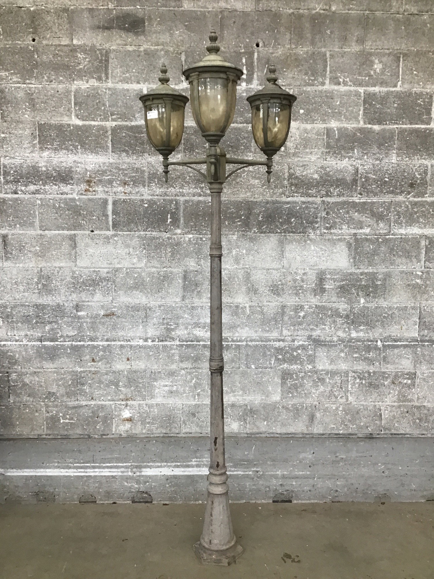 Cast aluminum three bulb post lamp that's 8' tall. Marked suitable for wet locations. SKU is 90537, which took me to the "Bellagio 96" high bronze outdoor 3-Light Street Lantern" that sells for $659 at Lamps Plus. Looks about right. This one shows some exposure to the weather, but still looks pretty decent.
