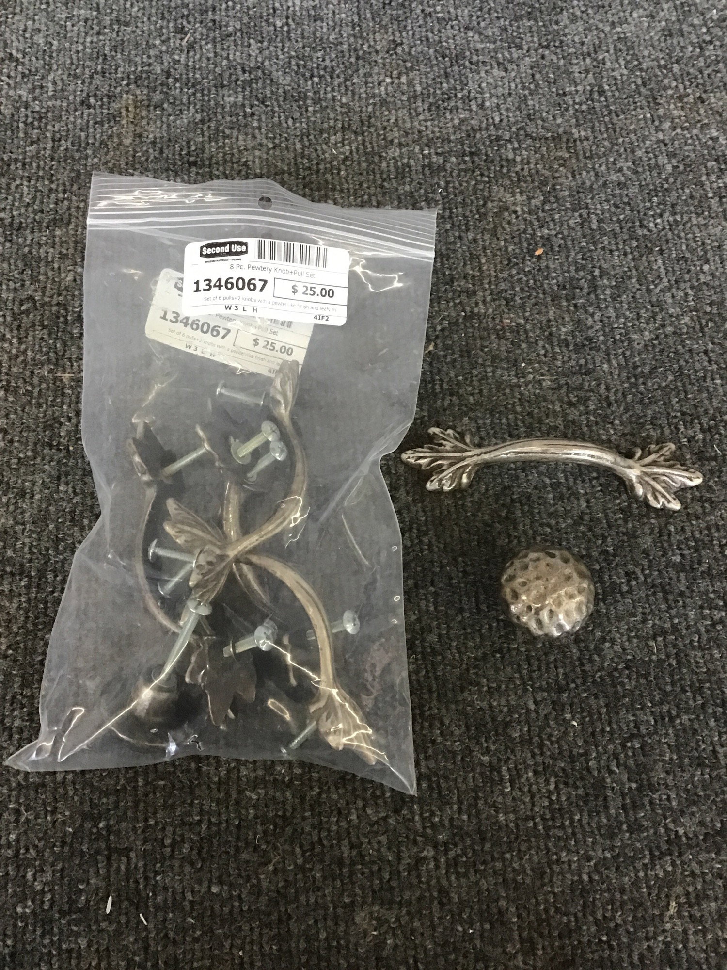Set of 6 pulls+2 knobs with a pewter-like finish and leafy motif.