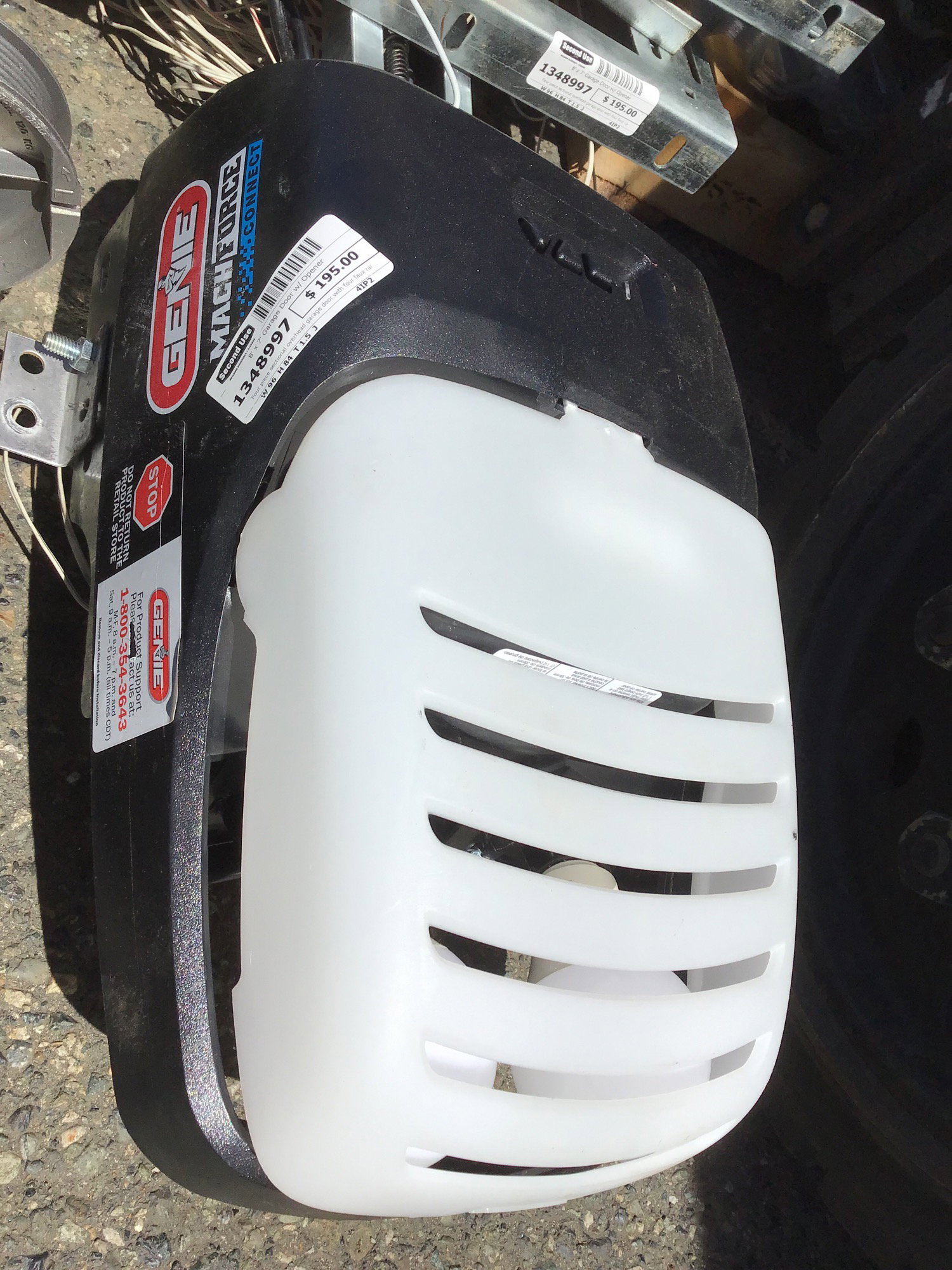 Four piece sectional overhead garage door with four faux raised panels stamped into each insulated steel face. Comes with track, hardware and a Genie opener. Removed from a whole house deconstruction project by our Salvage Service team, so hopefully everything is here and it's ready to reinstall. Item may have cosmetic damage. Photo may be representational.
