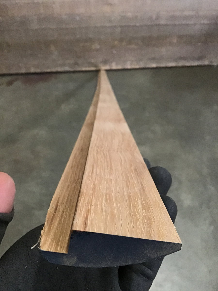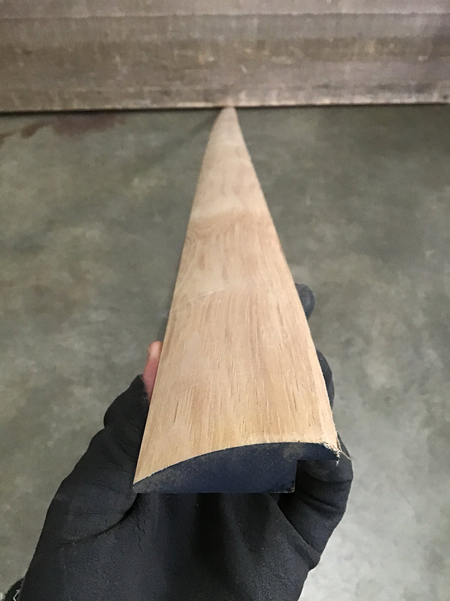 Unused/unfinished, 9/16" x 2" hickory overlap reducer. Round edge. 22 pieces that range from 7'-8'.