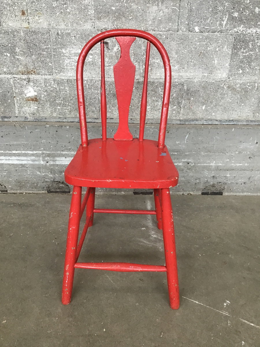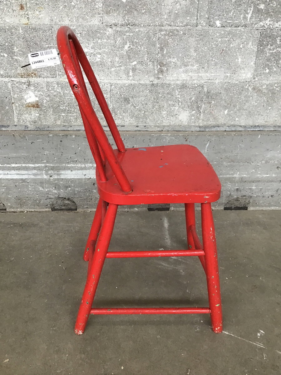 This solid wooden chair is bursting with rosy vintage charm. It has a glossy coat of bright red paint and would be perfect for a younger individual to sit and do young people things.