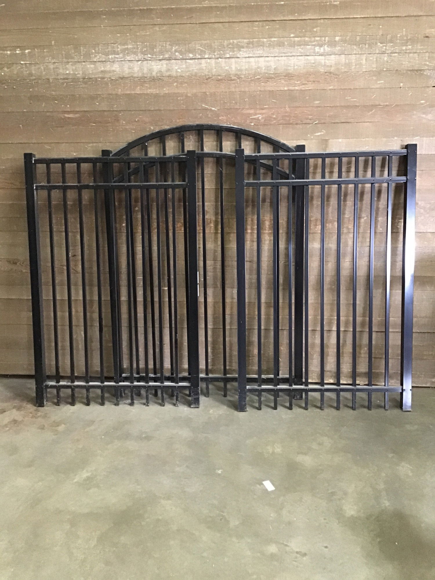 Never installed aluminum fence panels and posts. Connectors/hinges/latches not included. Includes two rectangular panels 40.5 x 61; one arched panel 47.5W, 61H at edges 66.6H at top of arch; two posts with base plates 51H, two posts with no base 72H.