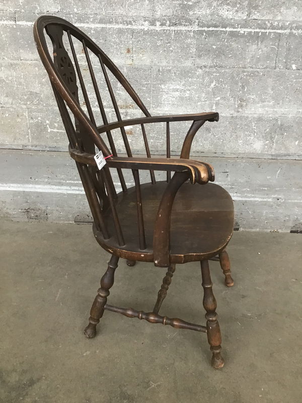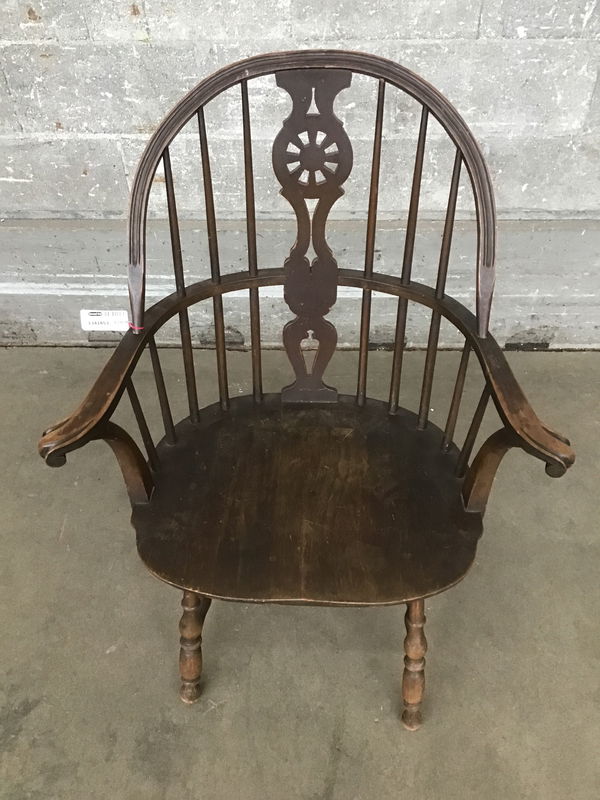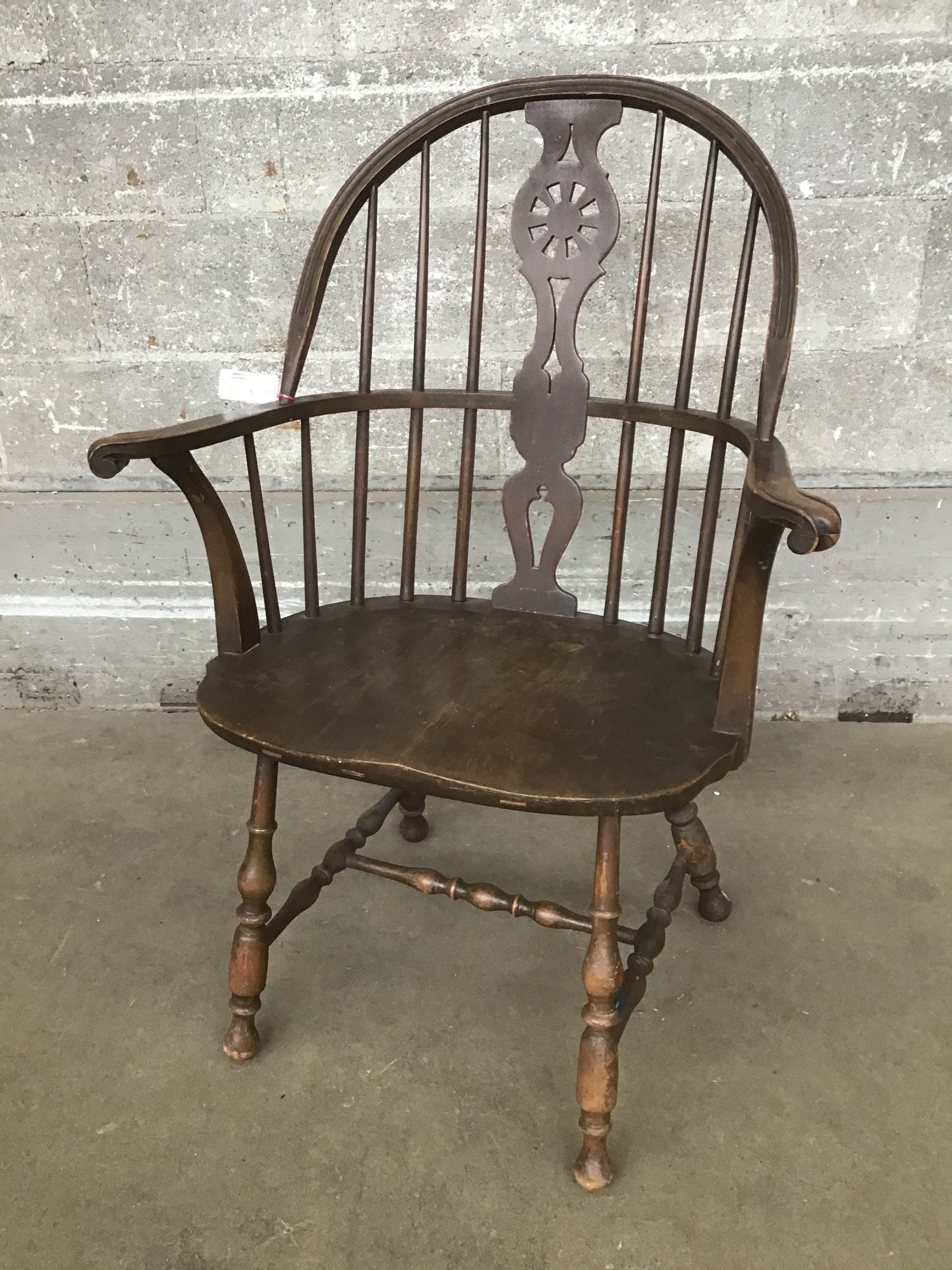 A truly beautiful specimen of an American Windsor chair, likely dating to some part of the 19th century. This is a sack back style chair with an ornate wheel medallion topped splat, which is uncommon in American Windsors! The legs are as wonderfully turned as you could hope to see in a Windsor chair, and the bow-shaped continuous arm section is another exciting feature. The seat appears to be fir, the arms and legs are maple - both typical choices for good period examples of these chairs. There's lovely patina all over, with fine crazing common to older finishes. The chair has had repairs to the seat-leg joints, but is in good condition otherwise - and plenty strong enough for sitting!