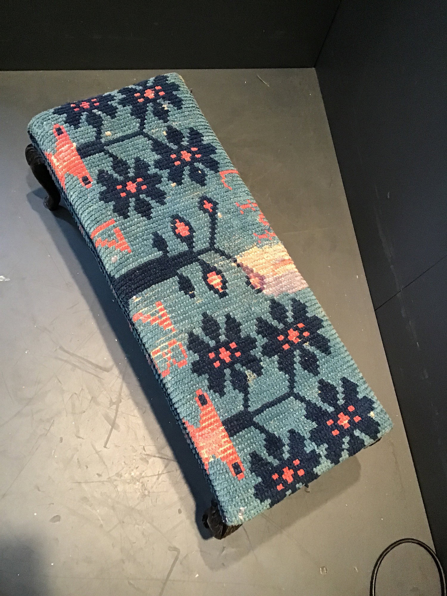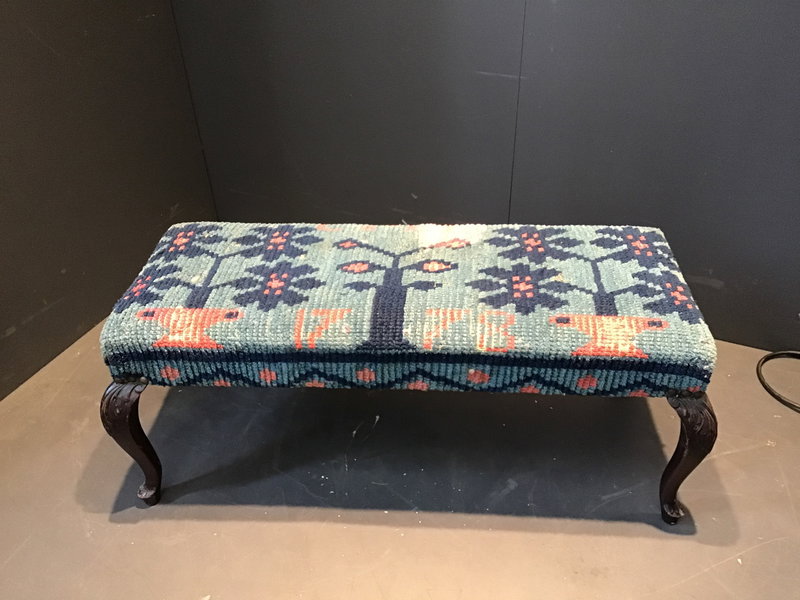 One of a kind antique pholstered bench from 1778! This bench was around when the American Revolution was just getting going and you wouldn't be able to tell. Curved wooden legs with carved designs and a hand crafted blue seat cover that is just beautiful. The initials CMT and the year 1778 are woven into the design of the cover.