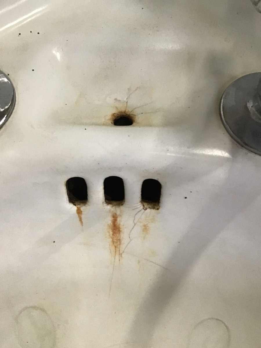 Antique Kohler corner bathroom sink. Includes original mounting brackets. Will need a refinish but is overall good condition! Dated on the back 6/11/15.