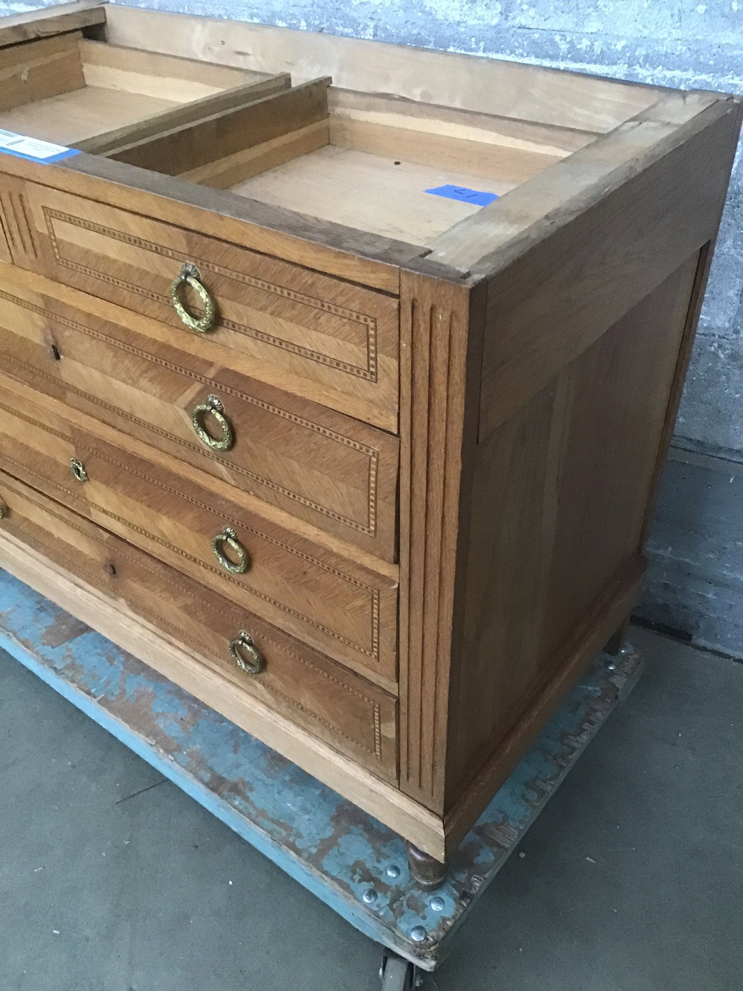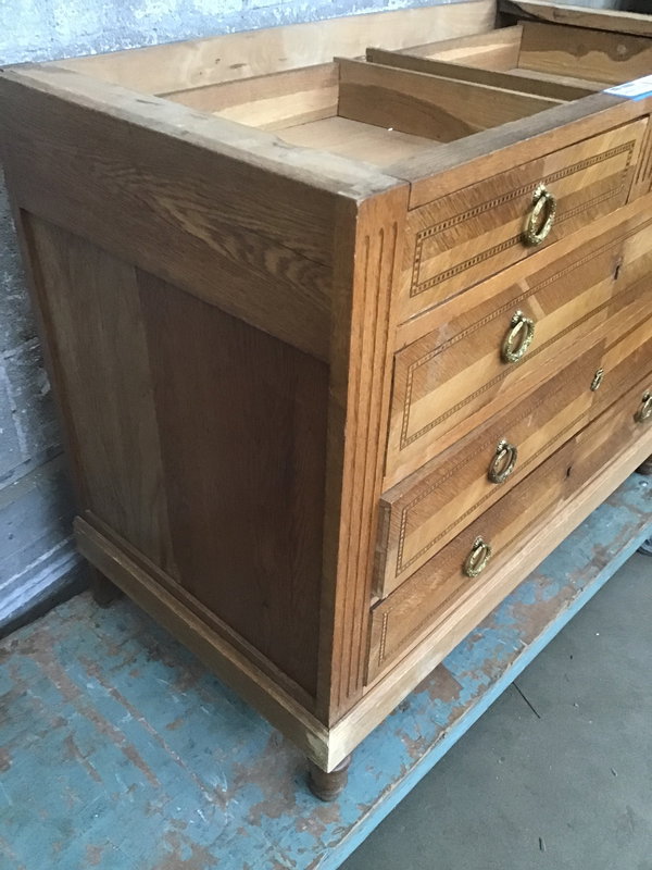 This Neoclassical "commode" dresser, despite its obvious need for a new top, has a commanding and refined presence. Finely detailed inlay paneling with quartersawn oak, ornate bronze pulls, and fluted borders boast the quality of craftsmanship that has allowed it to withstand many decades and a recent attempt to convert it to a vanity (hence the toplessness). This piece is in a great starting point for someone willing to do some final restoration - the vanity top its previous owners used was simply too heavy and caused several of the joints to loosen, but none are cracked or truly damaged as far as I can see! It comes with a bag of the remaining escutcheons and lock mechanisms to be reattached/assembled. If you want help finding a new stone or wood top for this dresser, we have both! Ask a coworker for help.