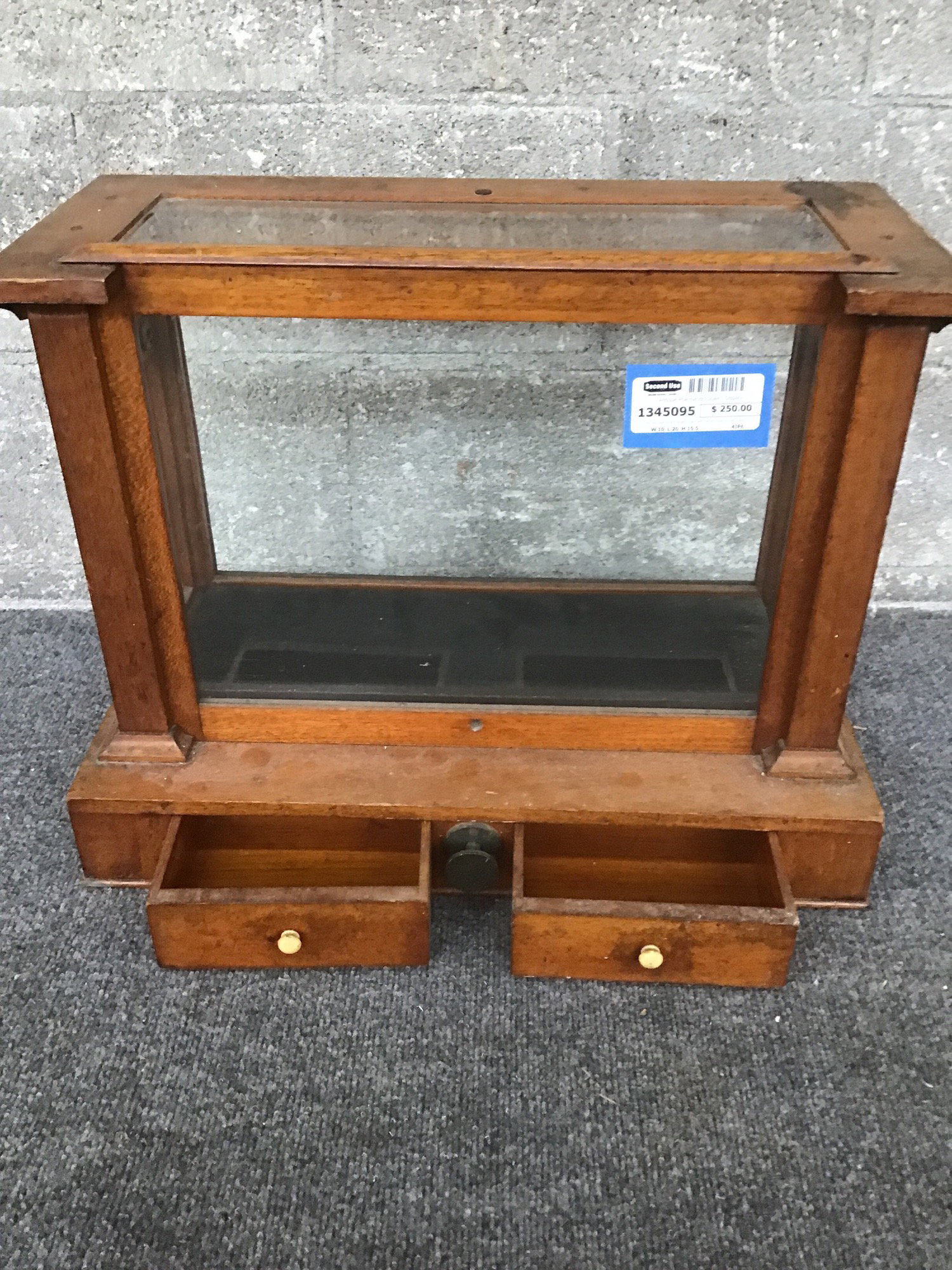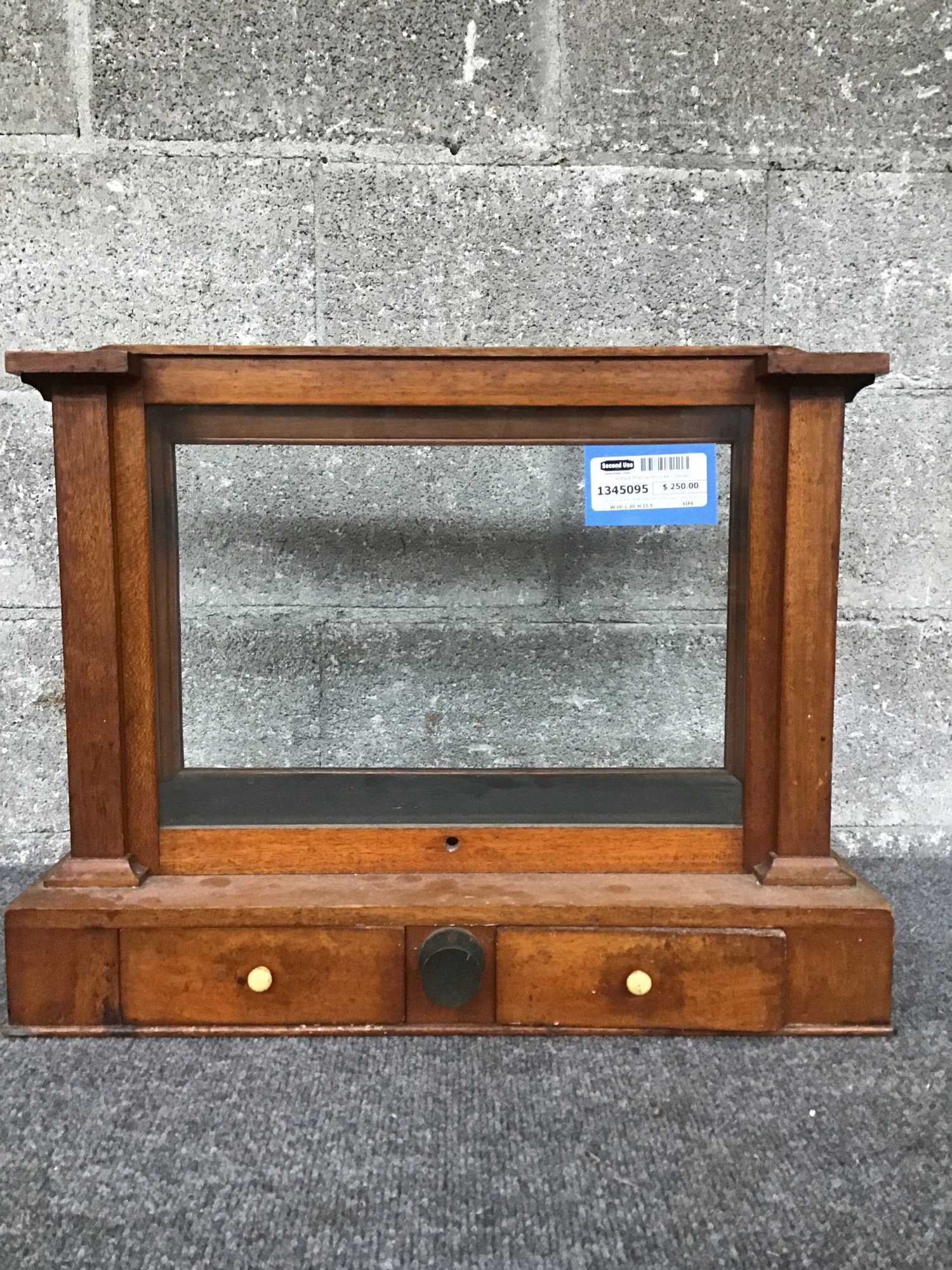 An antique pharmacists scale with what looks to be a solid oak frame, 6 wavy glass lites, two small storage drawers and a some non operational scale hardware pieces. Other than its intended purpose, this would make for a very regal display shelf.