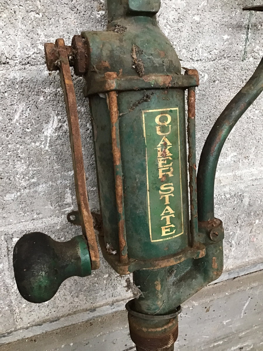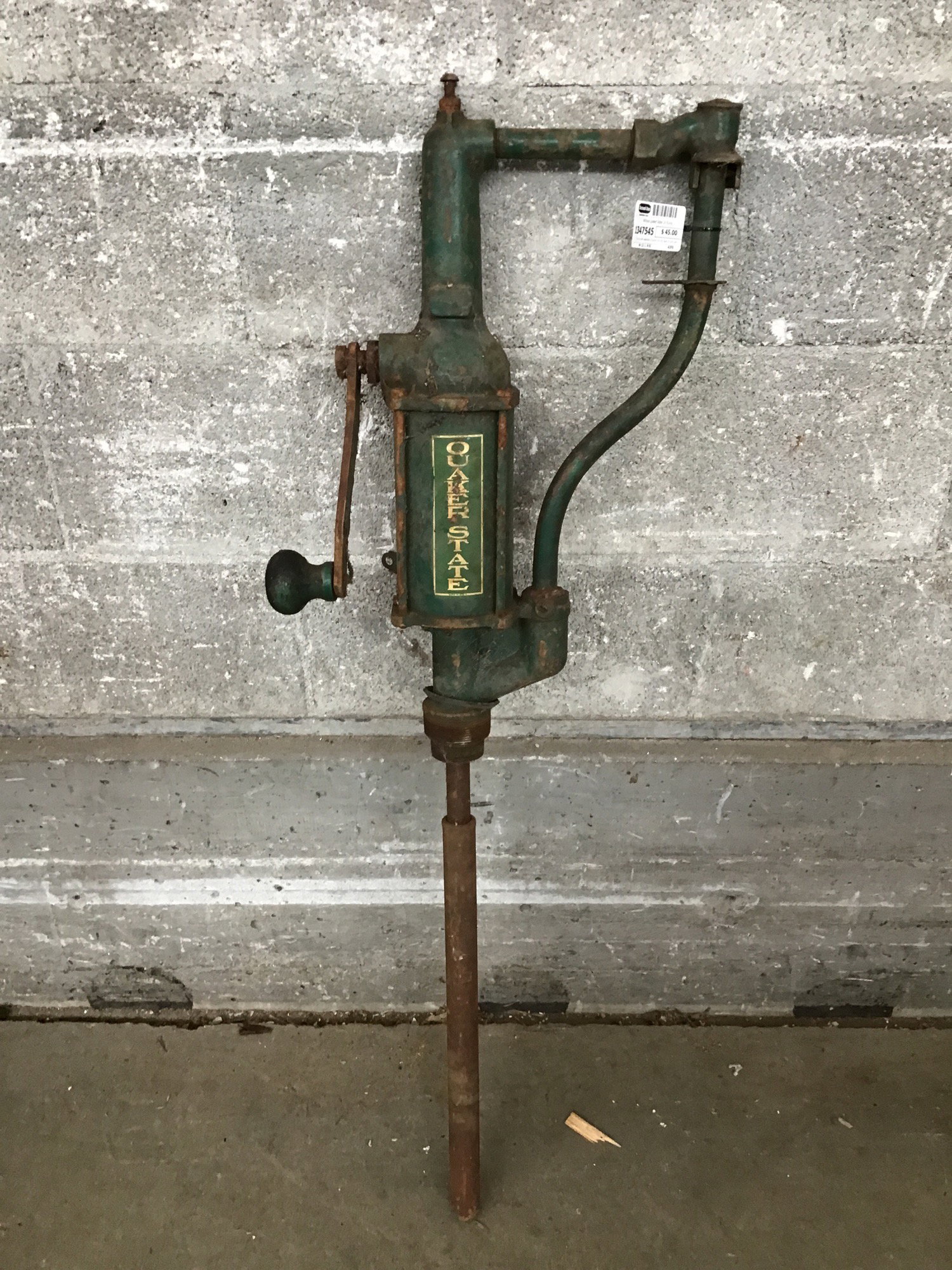 This is a well weathered oil pump from the days of yore with the old Quaker State logo on it with a green paint job.