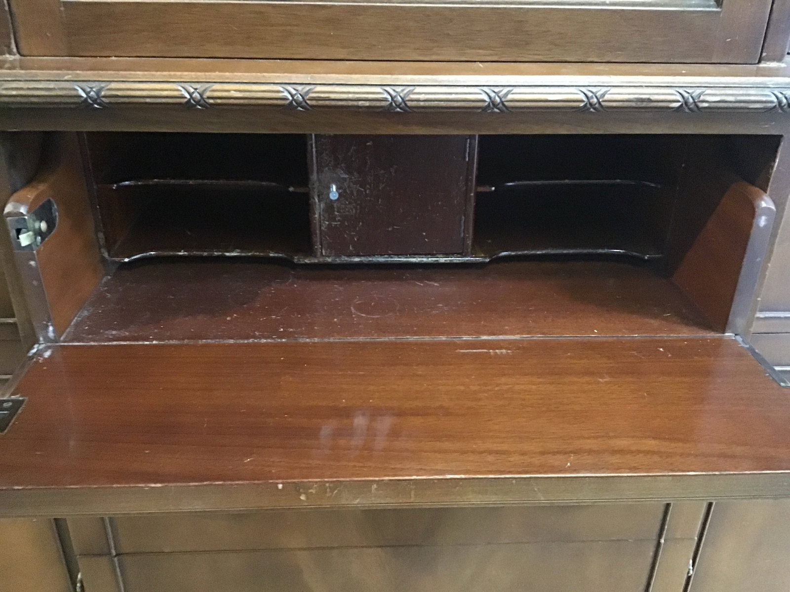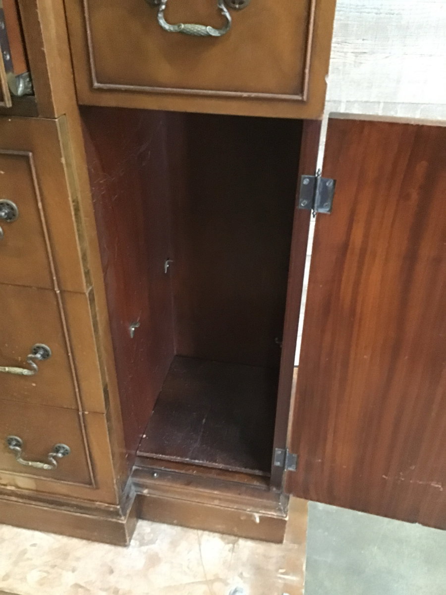 Beautiful Skandia Breakfront China Cabinet! Skandia operated out of Illinois from 1889-1941, though unsure on the date of production. Looks to be constructed of Oak with Mahogany veneer. The top drawer slides out and opens up to reveal a hidden secretary desk, wow. There are some condition issues and price reflects condition. The original keys for the upper cabinet are included. Also to note, the drawers are a bit sticky.
