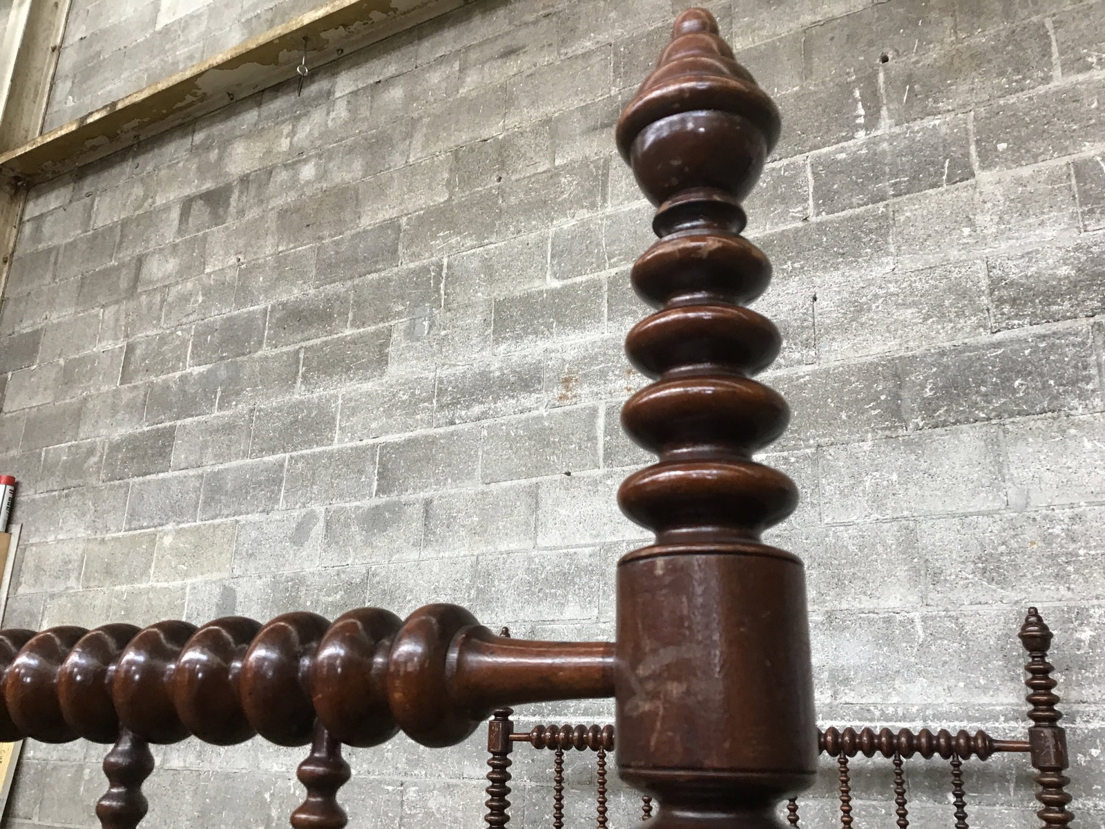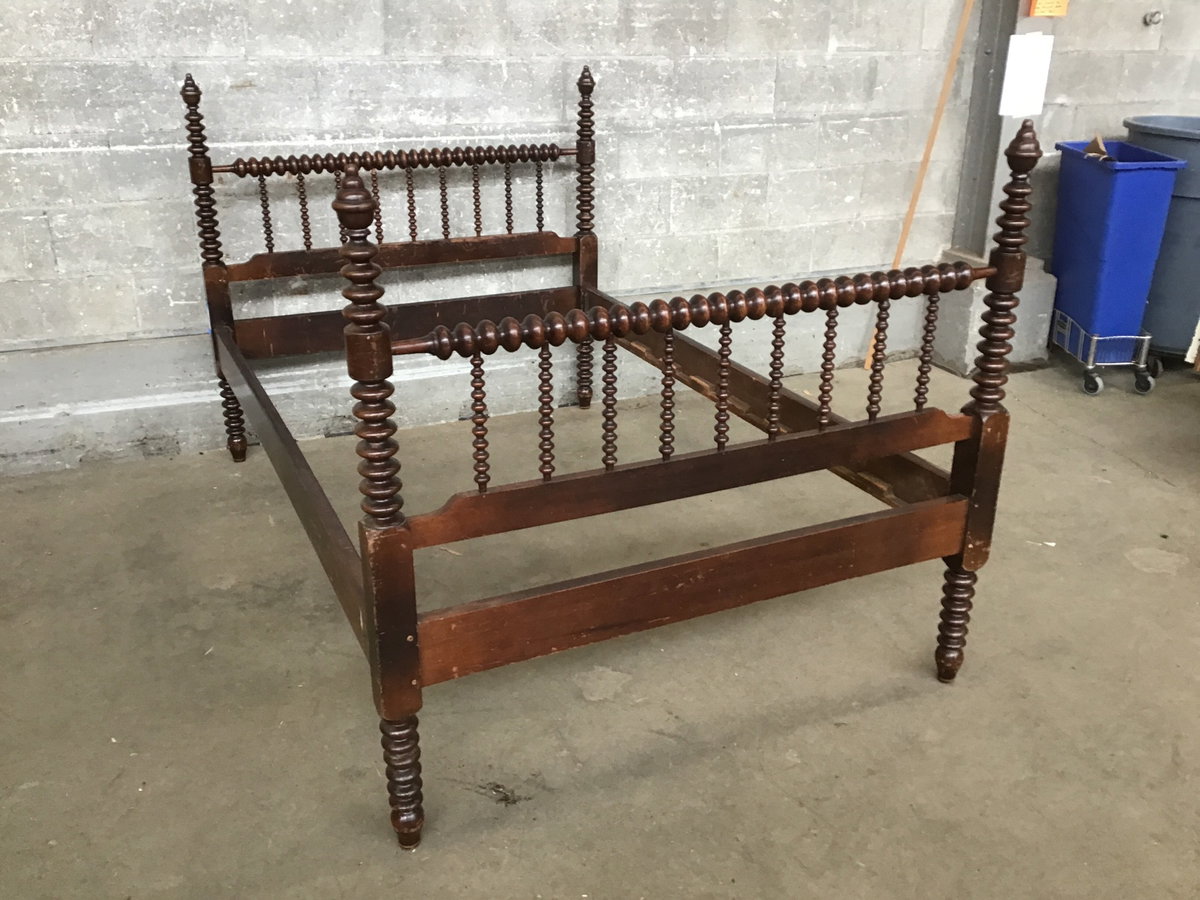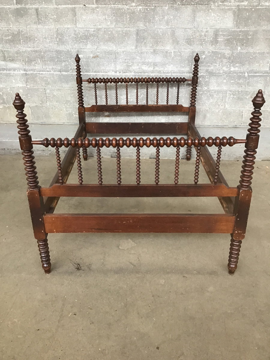An antique bed frame that looks to be manufactured out of a dark mahogany. It's comprised of a headboard and footboard (which are essentially identical in make) and two side rails. The head/footboards are made up of a top and bottom rail, connected by nine spindles, each of which, including the toprail and the corner posts, are spool turned. With mortise and tenon construction for the frame, the side rails can hold up to nine slats beneath your box spring. Estimated date of construction to be somewhere around 1850 to 1870 or so. The bed frame predates modern mattress standards, so it doesn't quite match up with any in specific, landing somewhere between a twin and a full, but there are manufacturers that make custom-sized mattresses and likely have a backstock that will fit this frame.