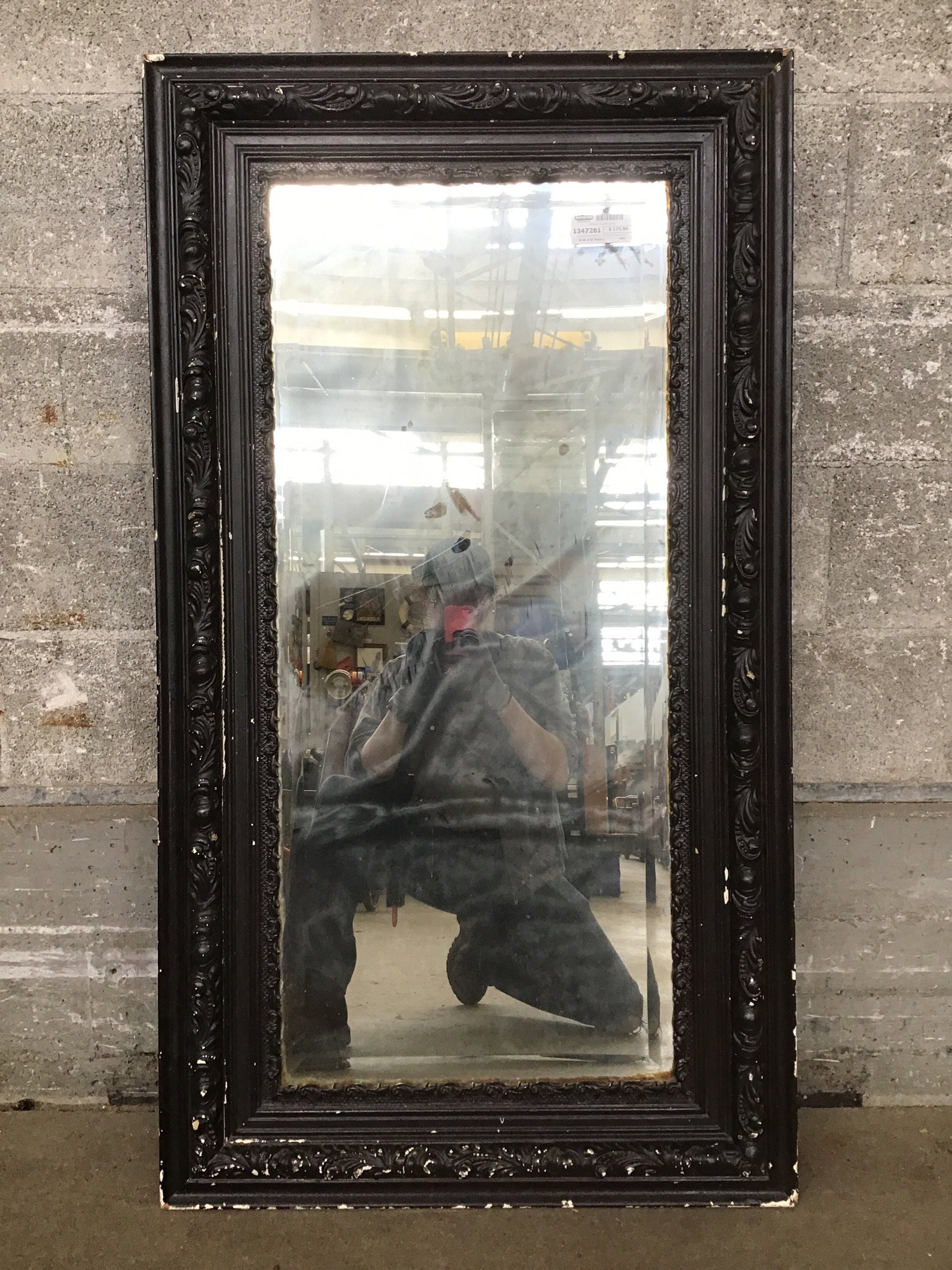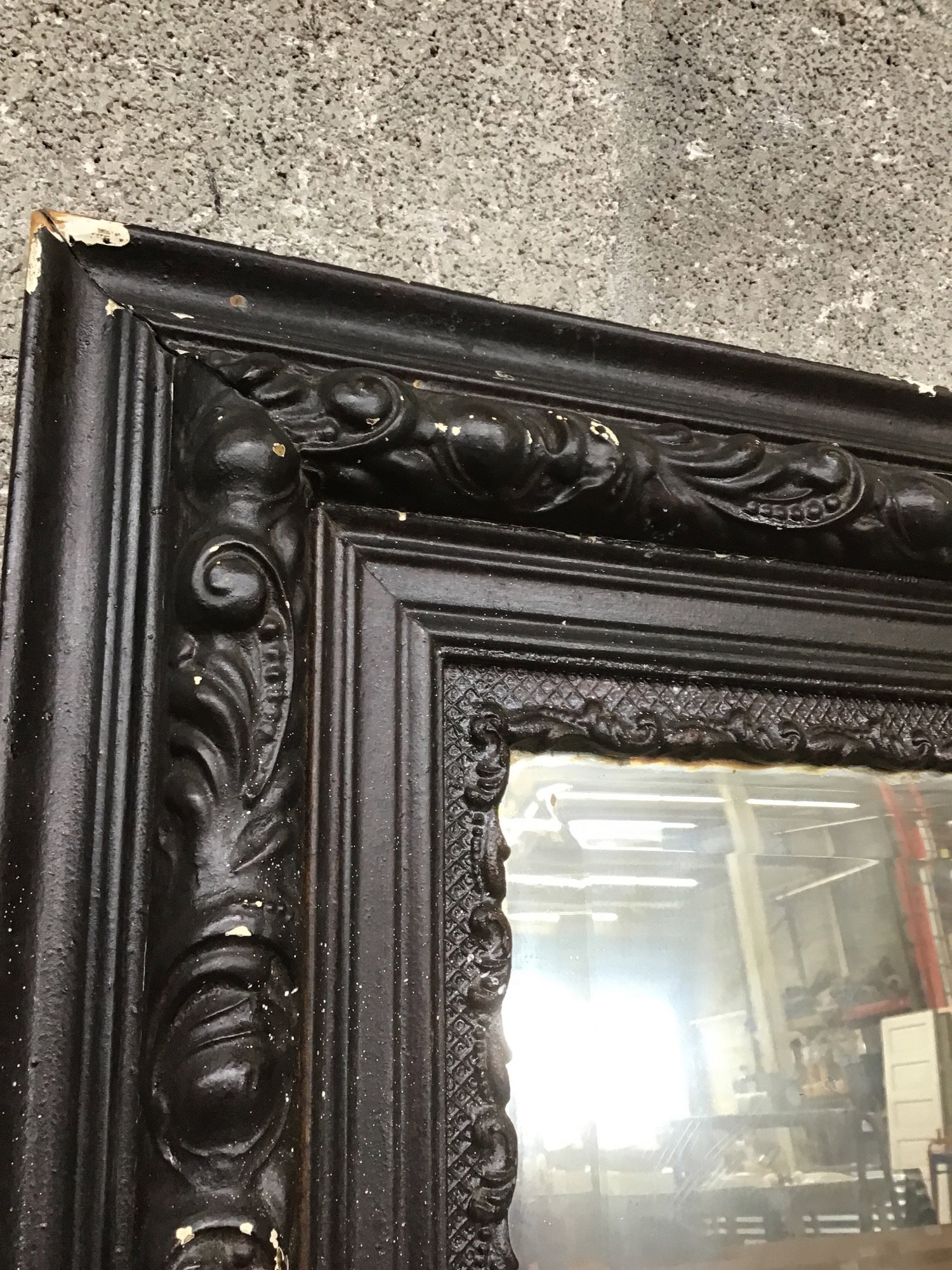 Antique Victorian style mirror with beveled glass pane and ornate floral frame all painted black.