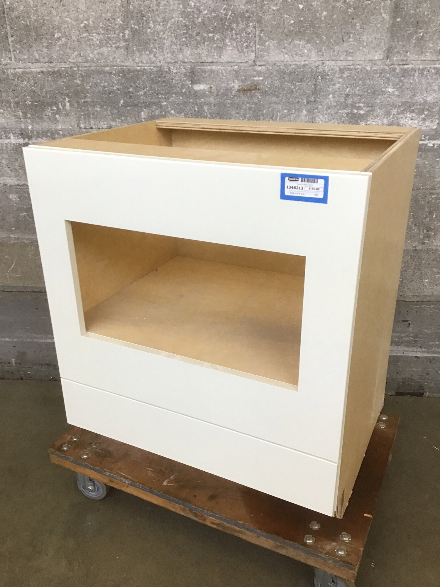 Really nicely built base cabinet featuring a 3/4" plywood box, professionally white painted face, and a dovetailed drawer with soft close glides. This has a 22-3/8" x 11-3/4" opening for a microwave or maybe a super compact wall oven. But you could get wild and hang a red curtain for a silly puppet show cabinet. I mean, why not?