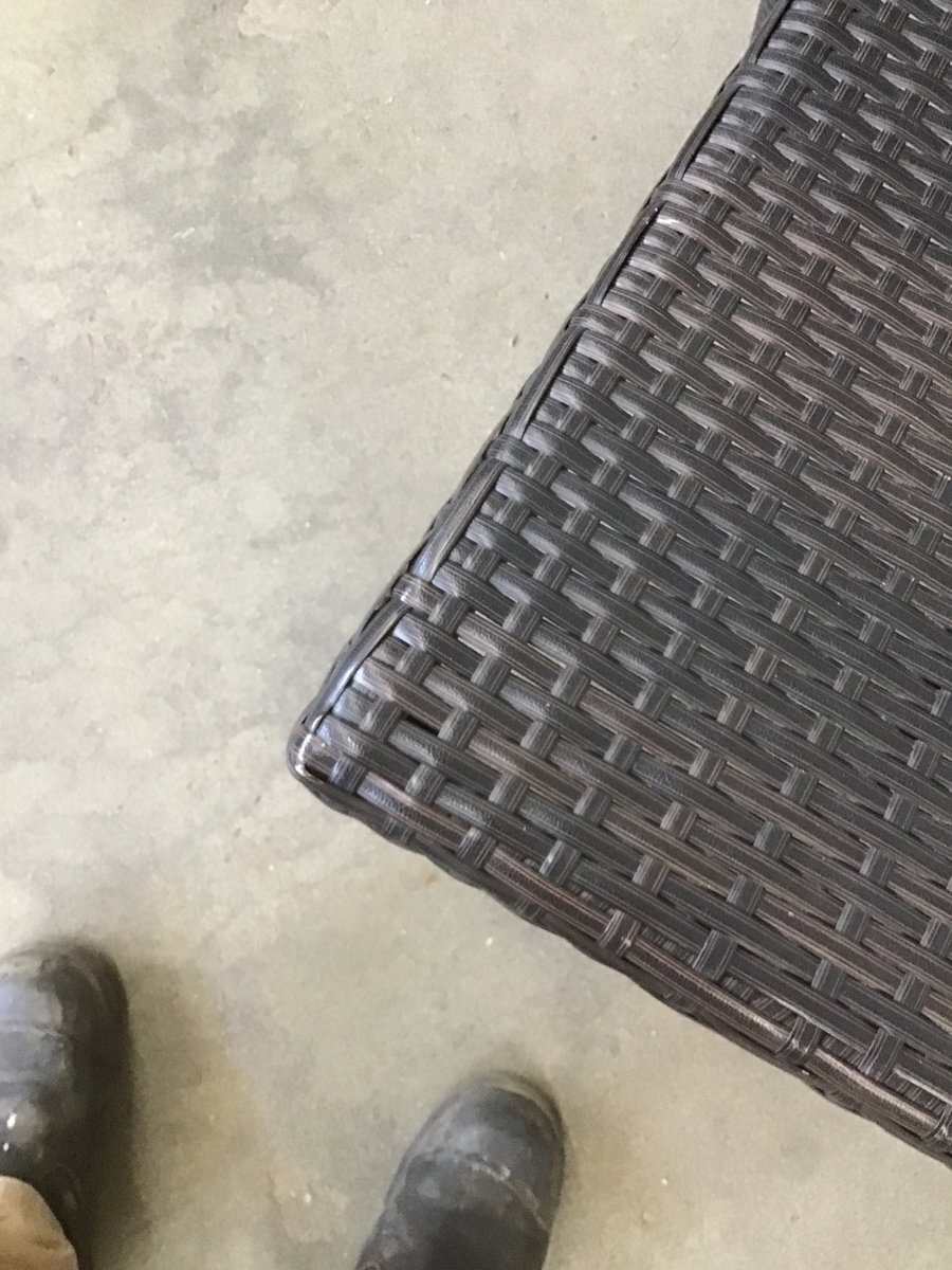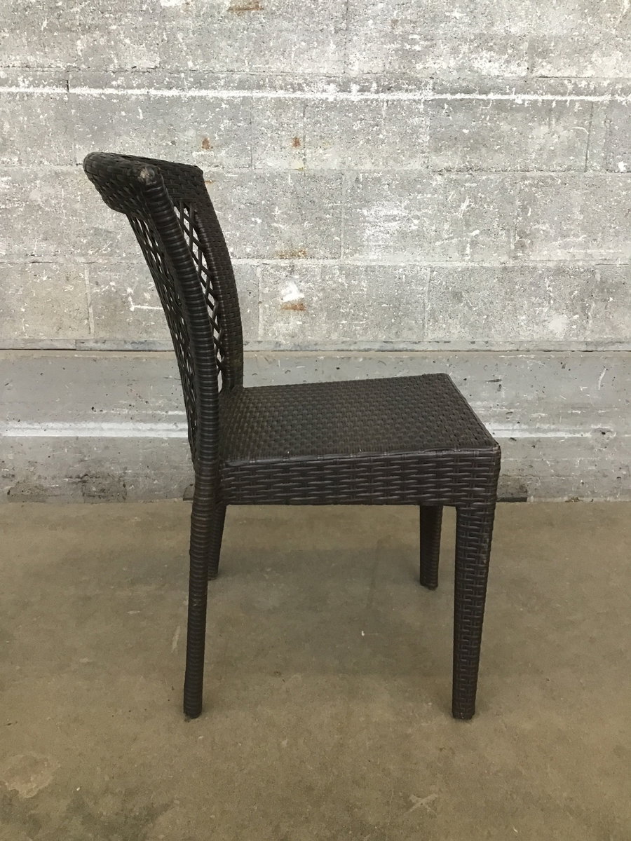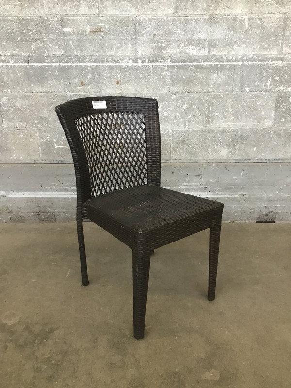 Brown plastic wicker patio dining chair. Used but not abused. We got a few more in so check out the other items on this job to see if you can snack the lot. 18" seat height. Photo may be representational.
