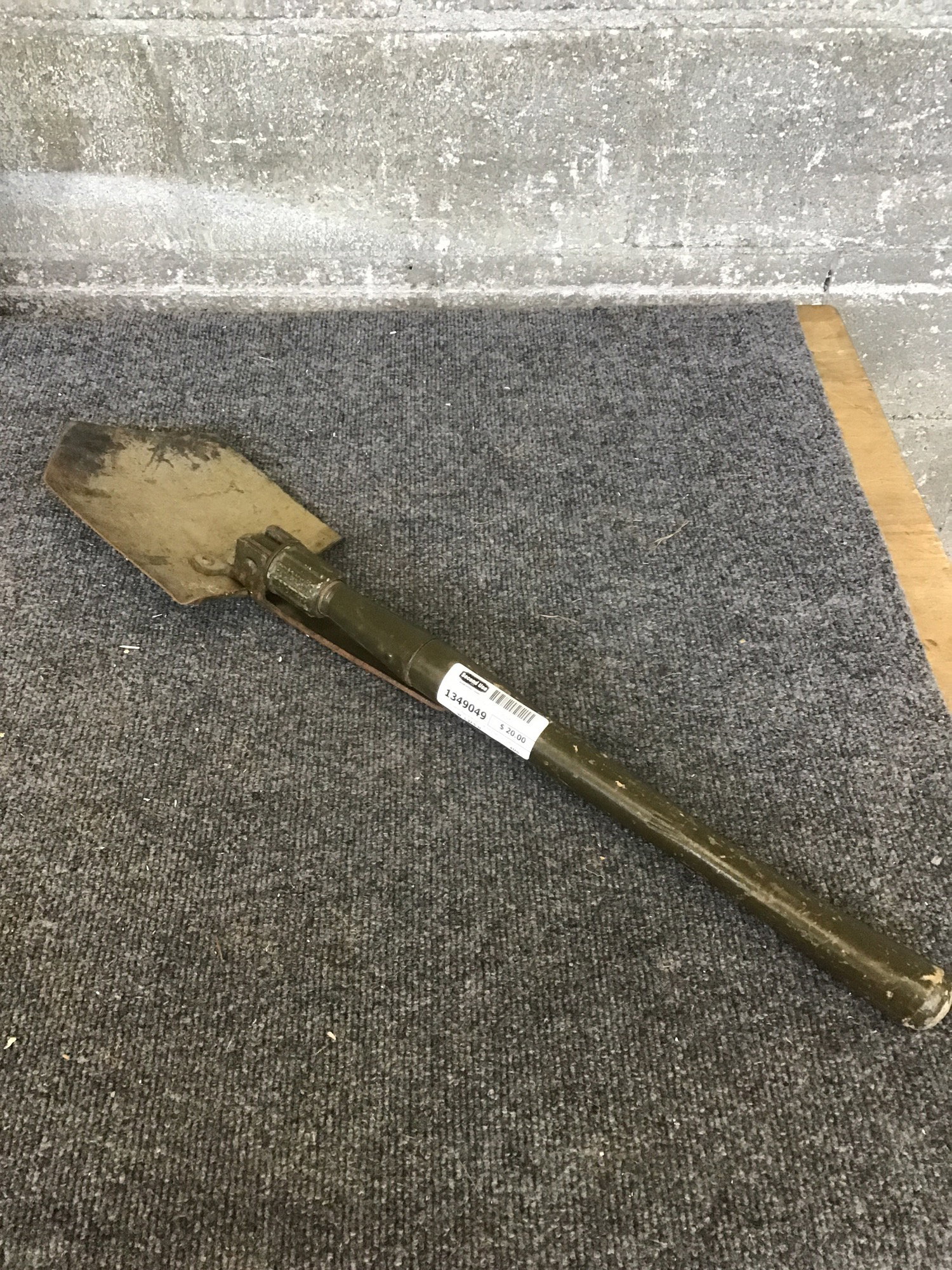 A trench digging shovel most likely used by military in a dull shade of army green. The shovel fold up an down nicely.
