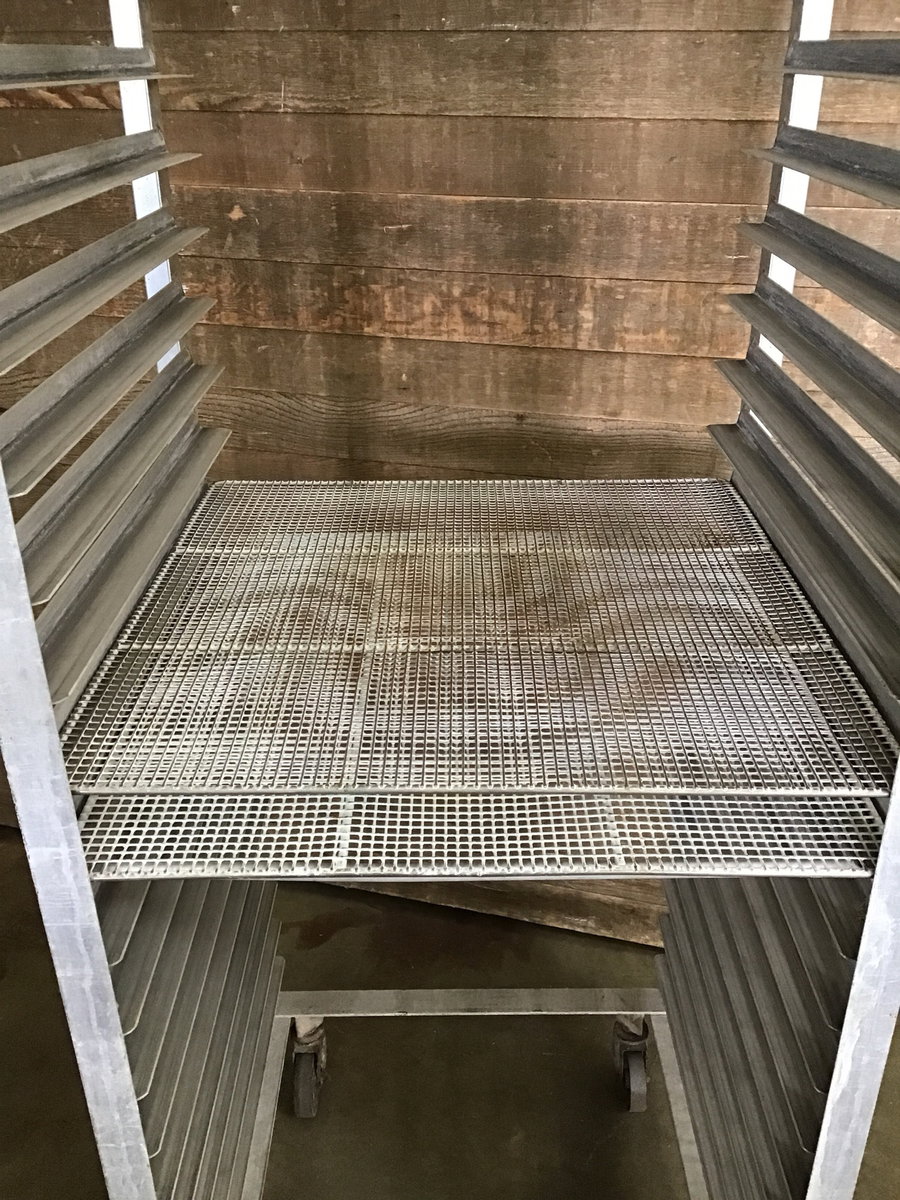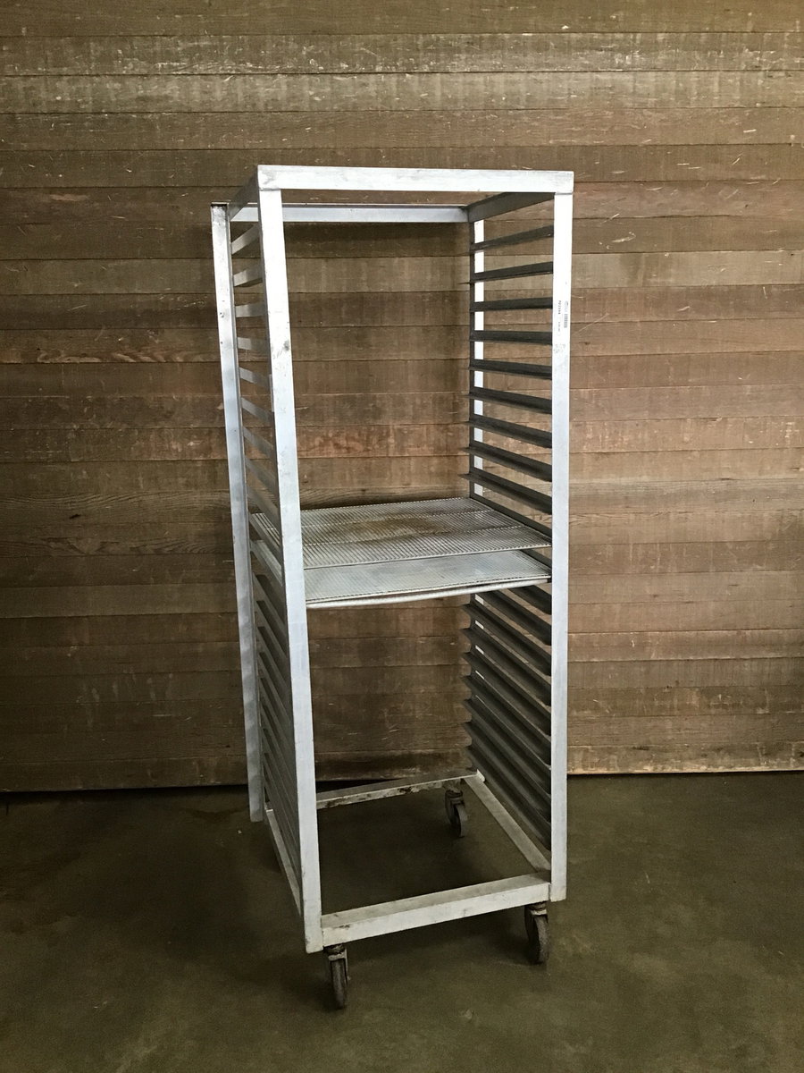 Rolling baking rack missing all but two sheets. Aluminum construction. Rolls around nicely!