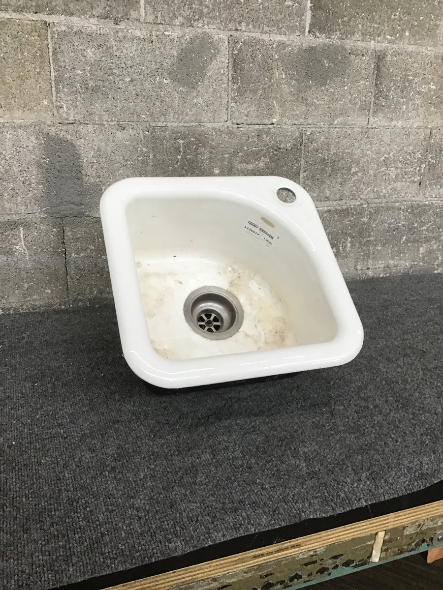 A cute little cast-iron bar sink with a hole for a faucet in one of the corners- perfect for tucking away at your in-home bar, van retrofit, or ADU!
