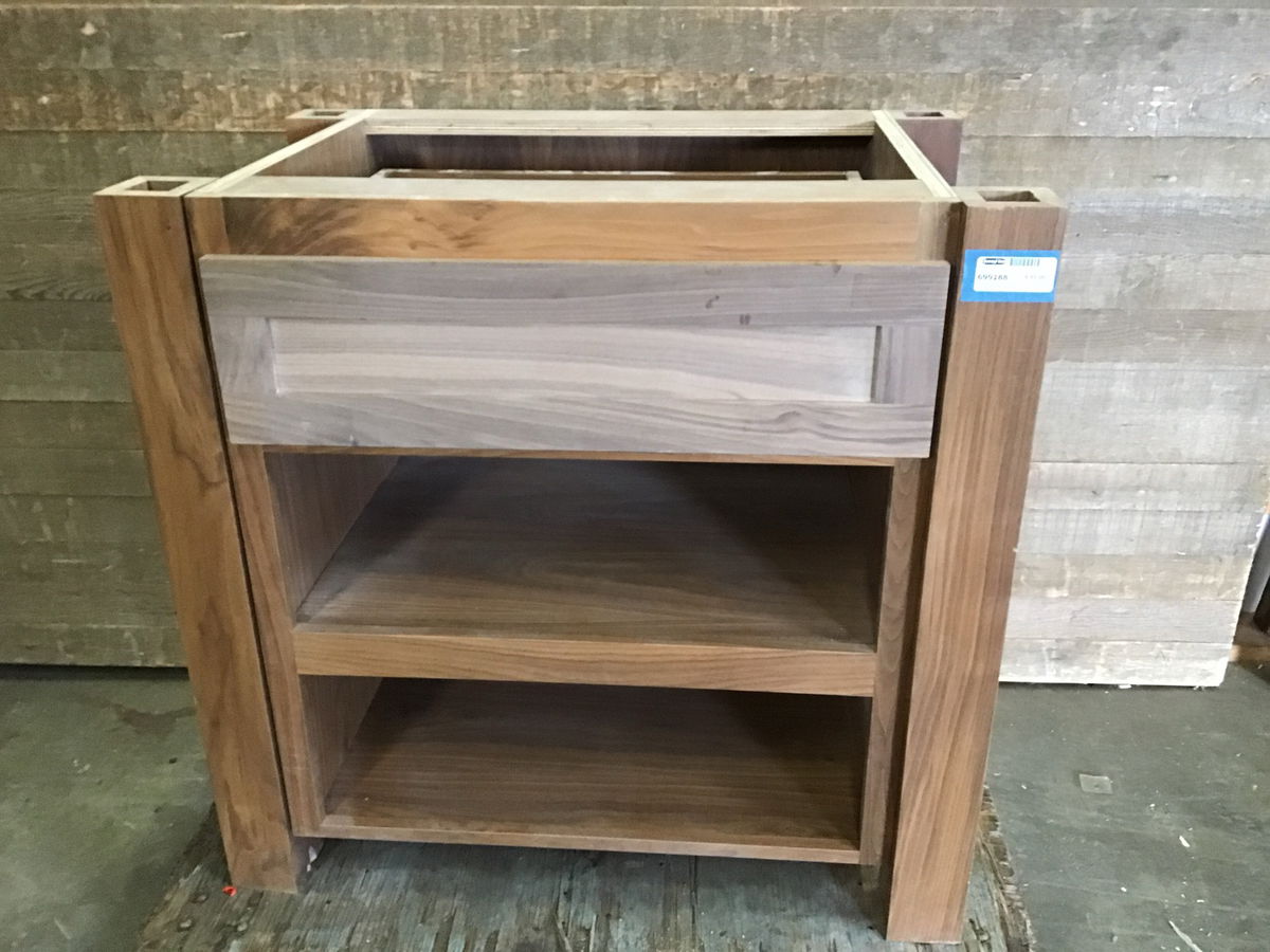 Walnut base cabinet with one unfinished drawer and two open storage shelves. Has four corner pillars made of solid walnut; the front left one needs adjustment. With a little effort on finishing details, this could look amazing.