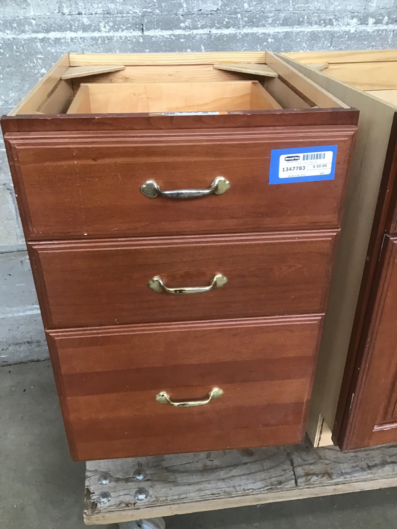 Dark stained cherry bath cabinet with three drawers, in good used condition.