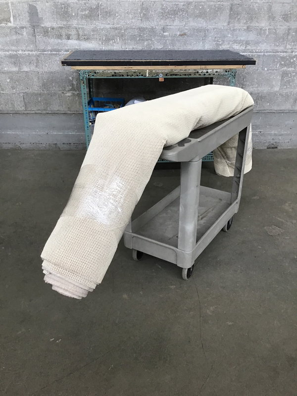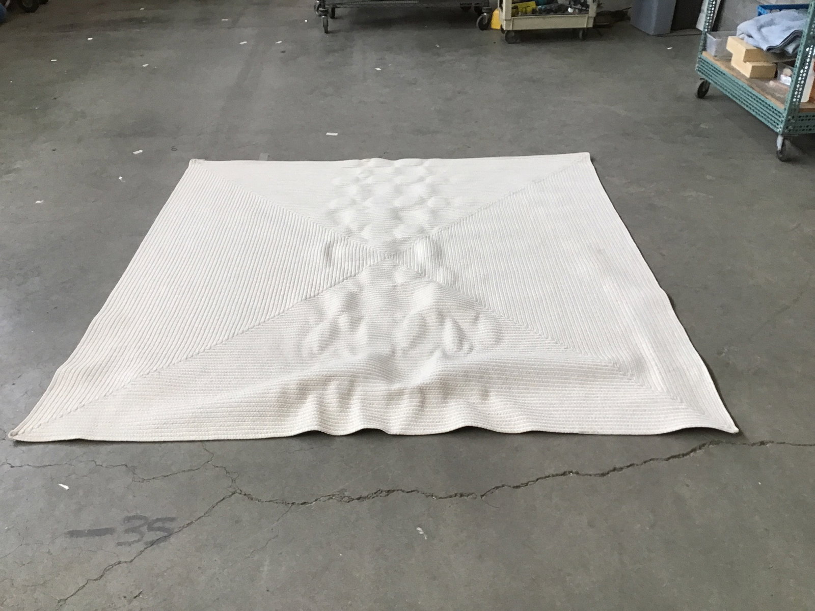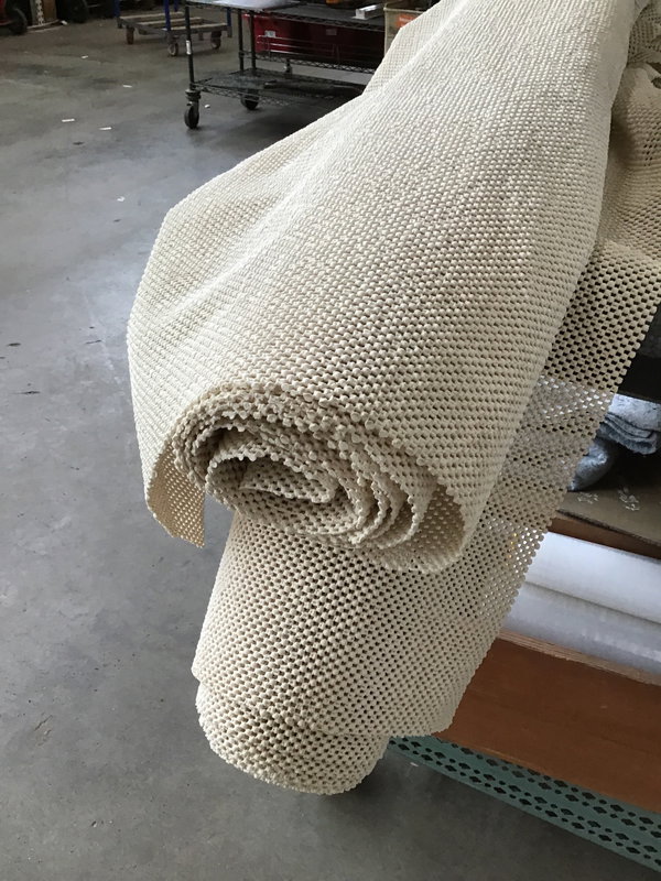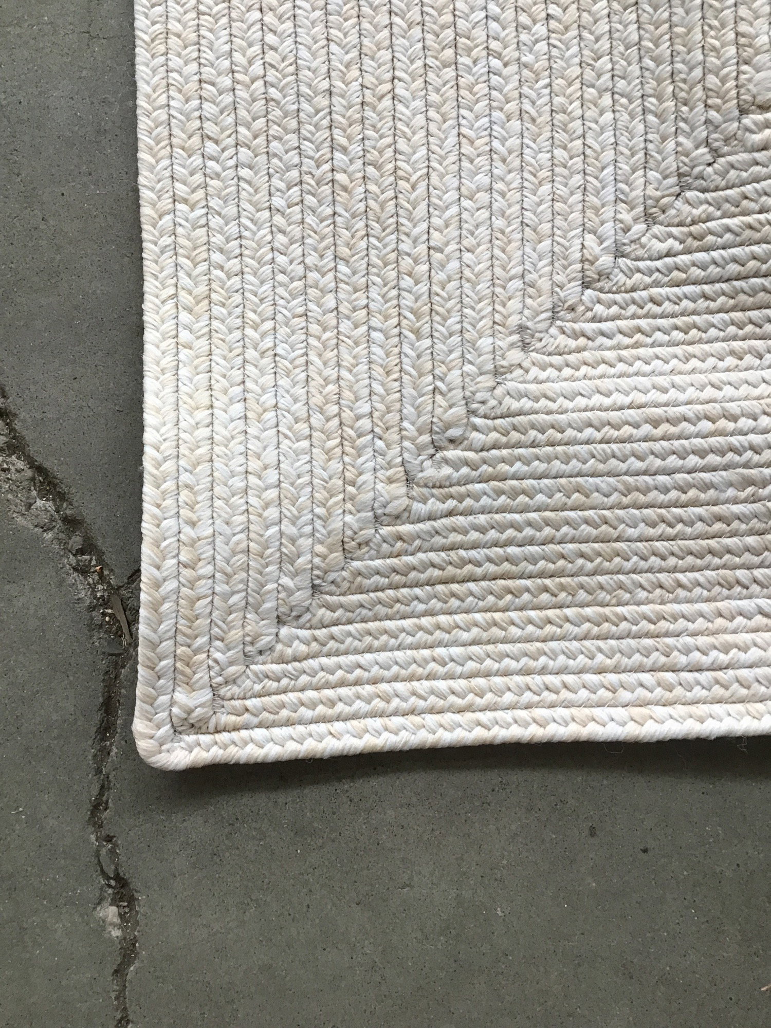 A large square braided faux jute rug in pale tan and off white, seems to be polyester. It's quite clean! Comes with a nonslip pad for underneath. Measured about 91" across but is probably slightly bigger once it fully relaxes.